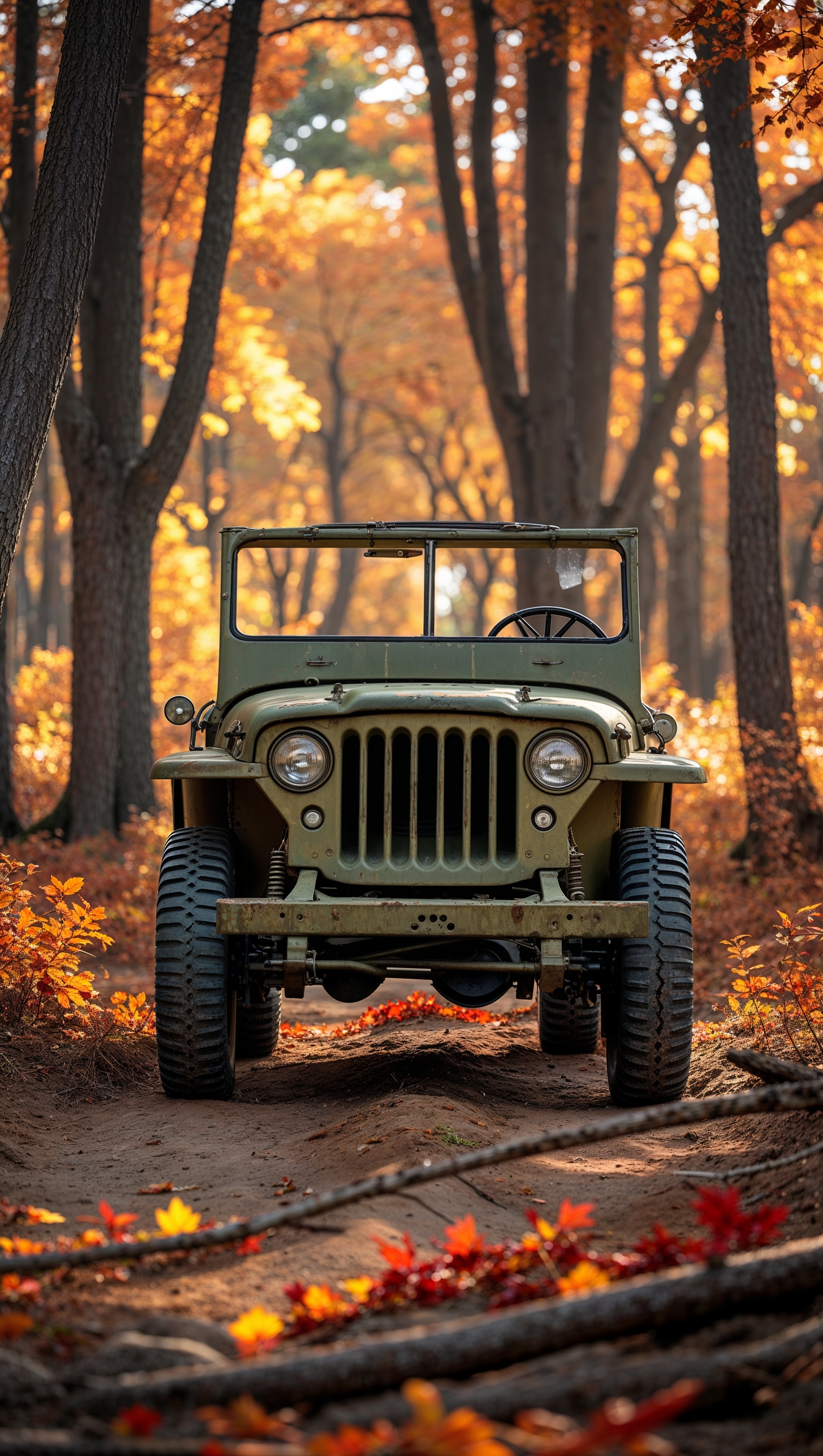 Vintage Jeep driving through autumn forest, golden leaves 1664x2944 Vintage Jeep driving through autumn forest, golden leaves