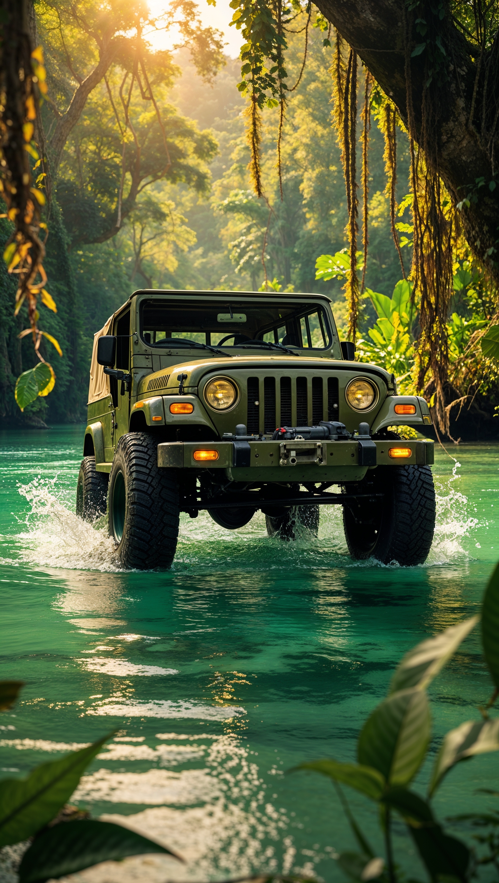 Jeep crossing a river in a jungle setting, cinematic style 1664x2944 Jeep crossing a river in a jungle setting, cinematic style