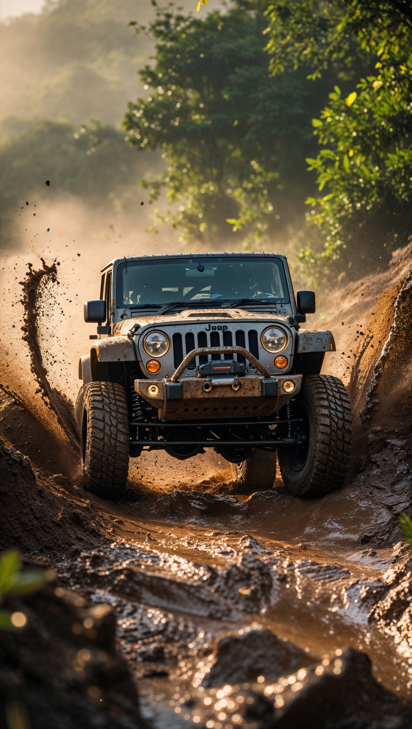 Jeep trail ride with mud splashes, off-road action shot 1664x2944 Jeep trail ride with mud splashes, off-road action shot