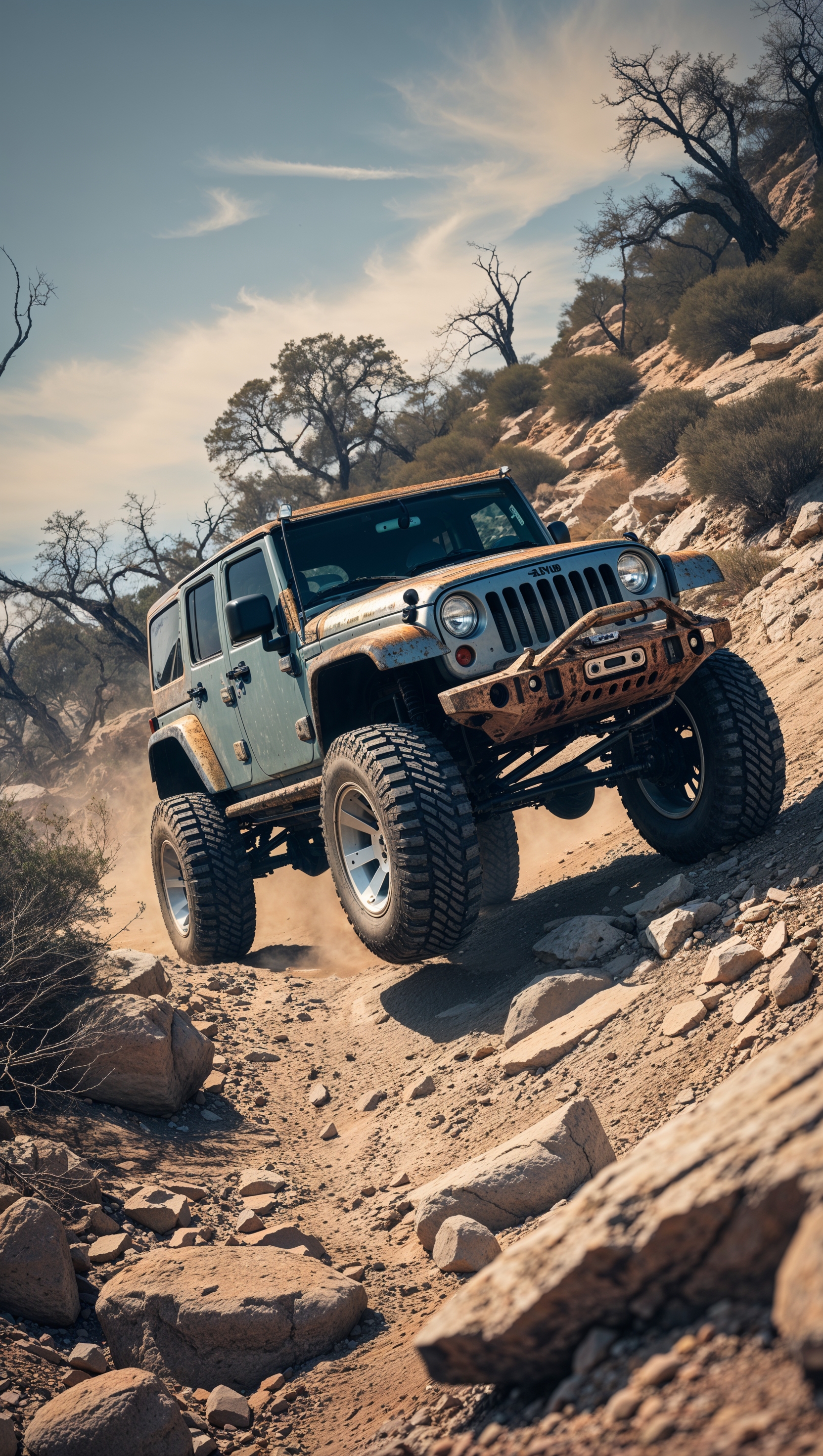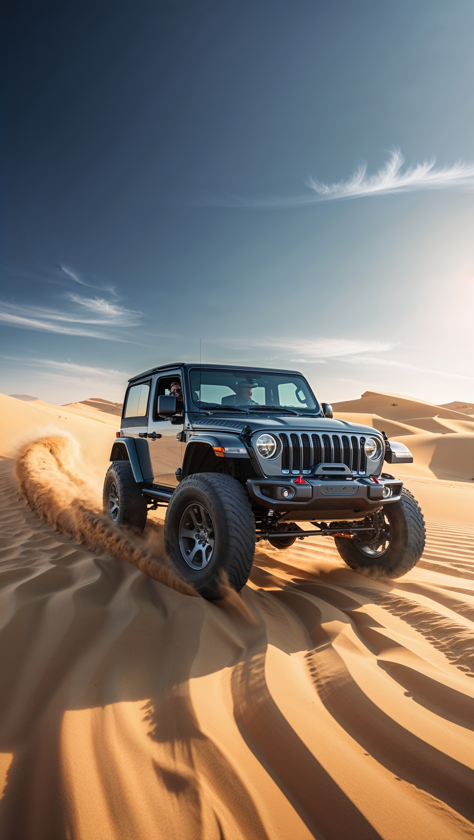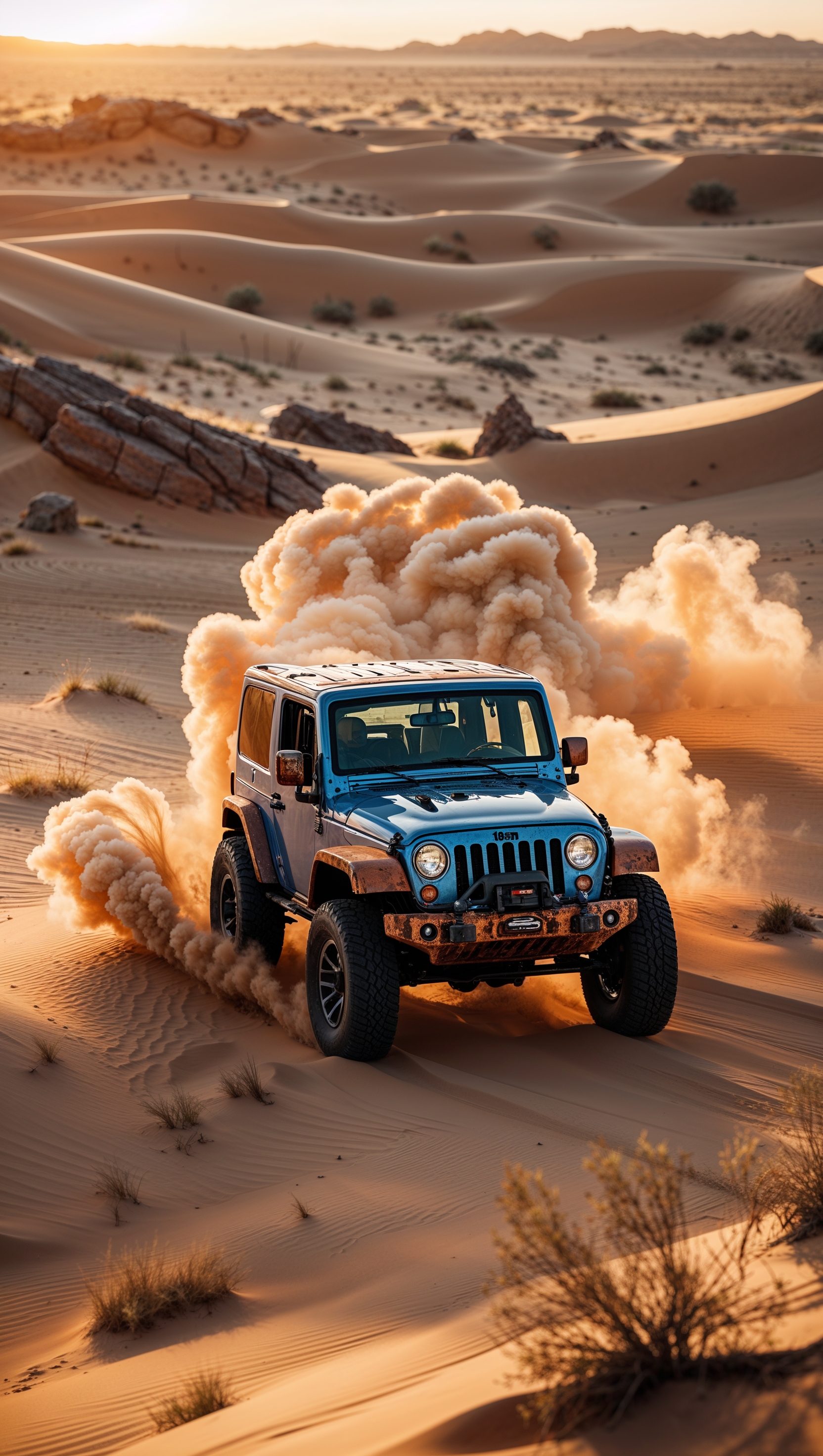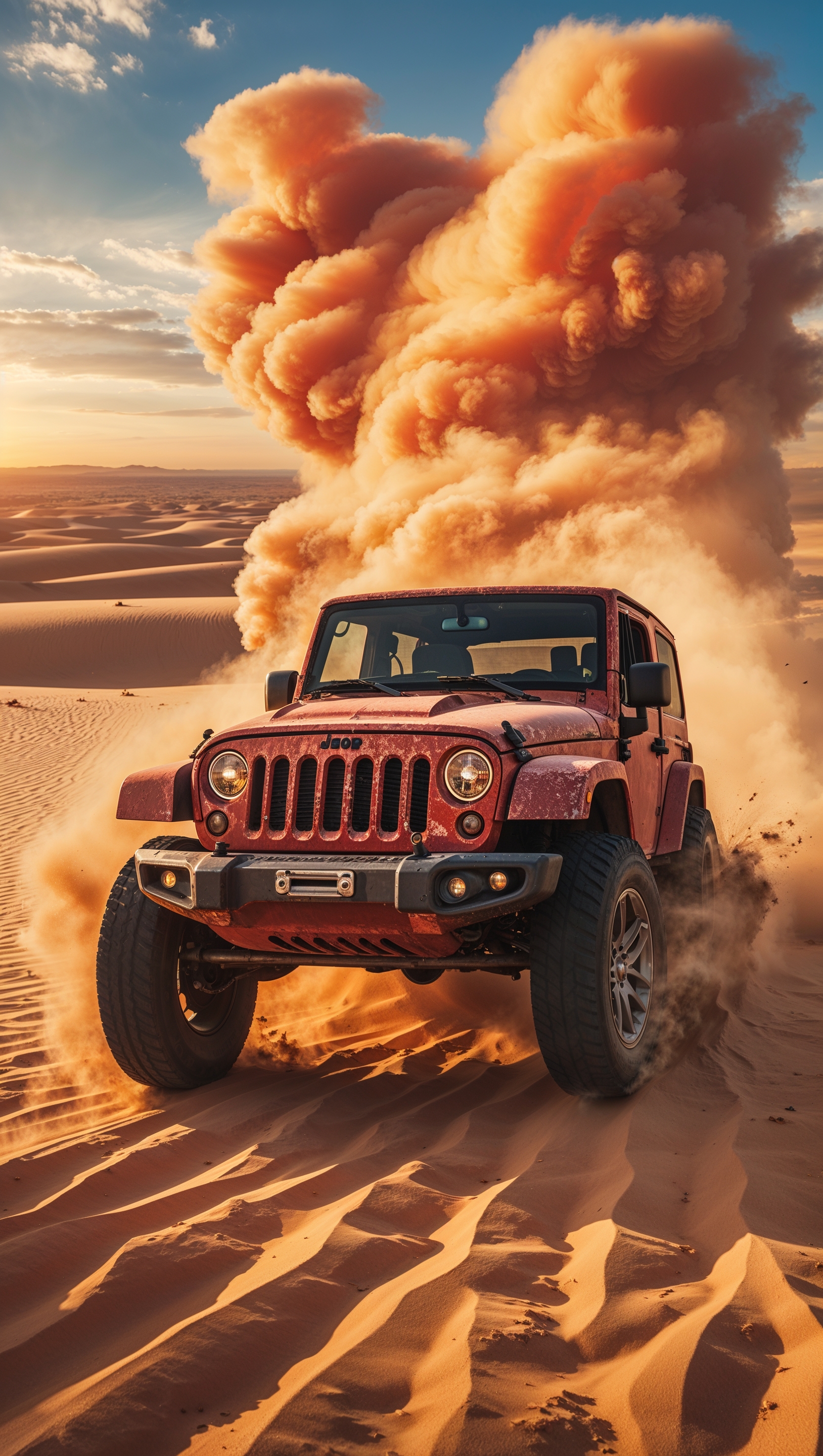 Jeep in the desert with dramatic lighting and dust clouds 1664x2944 Jeep in the desert with dramatic lighting and dust clouds
