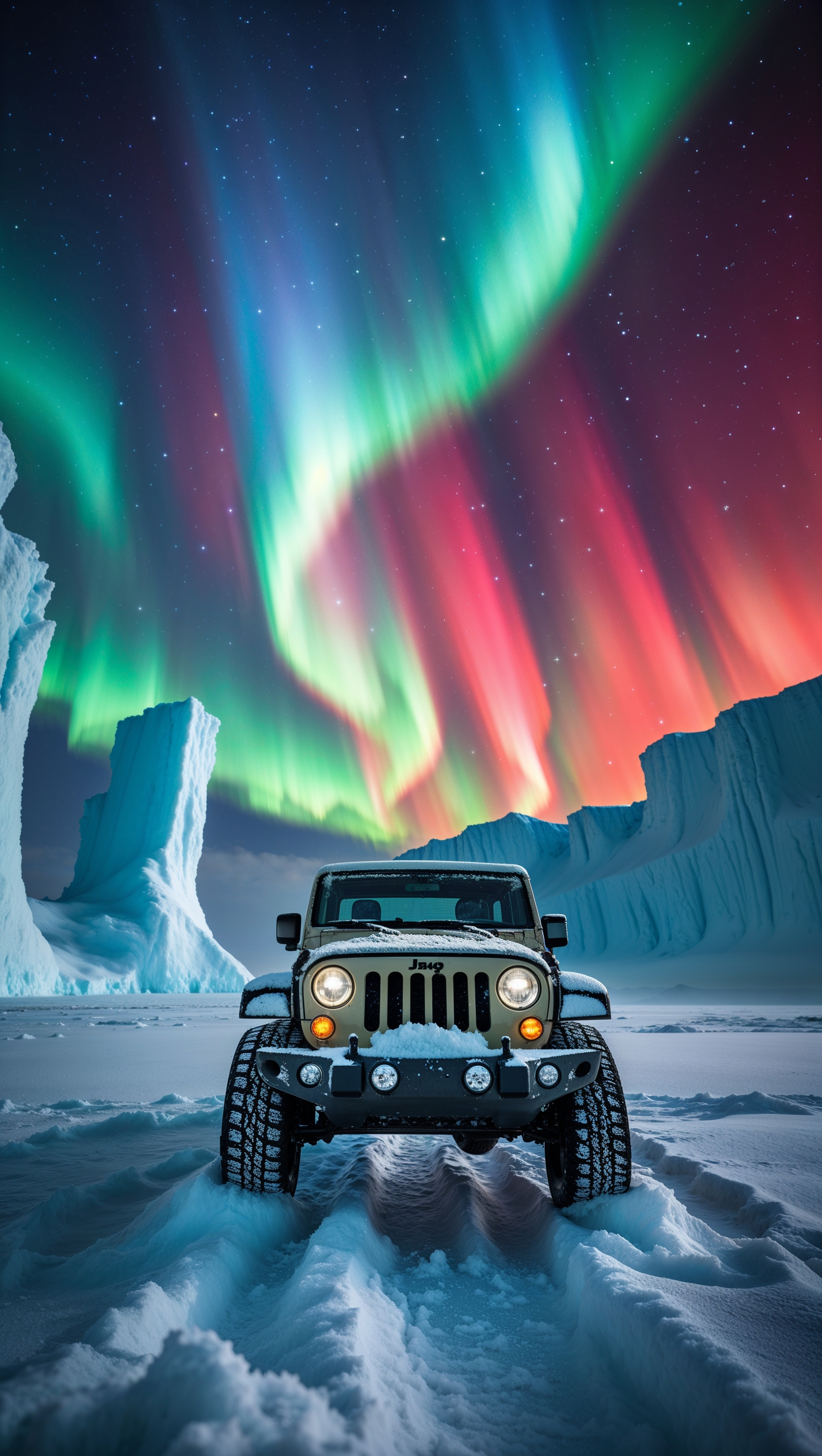 Jeep in arctic environment with northern lights 1664x2944 Jeep in arctic environment with northern lights