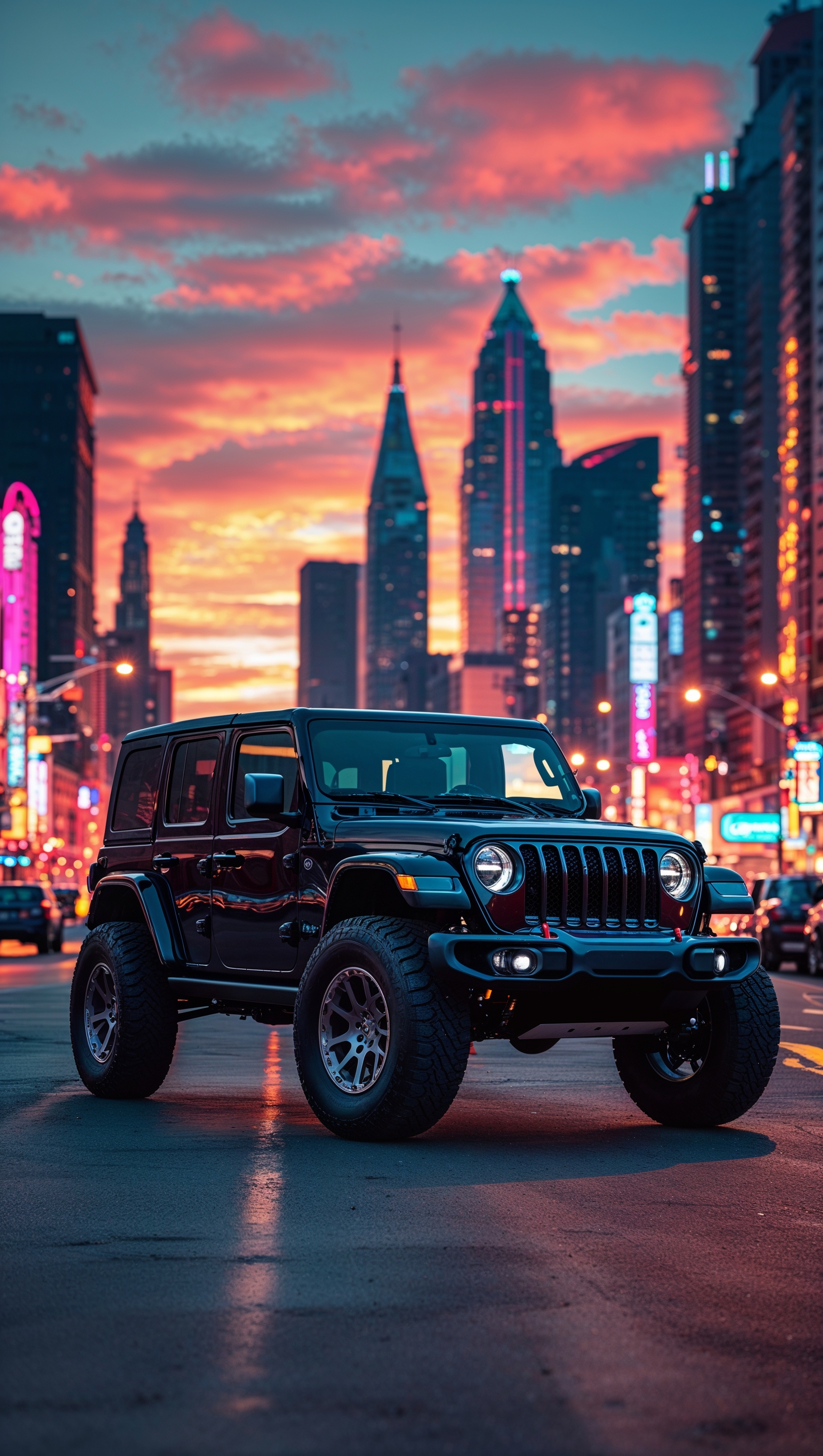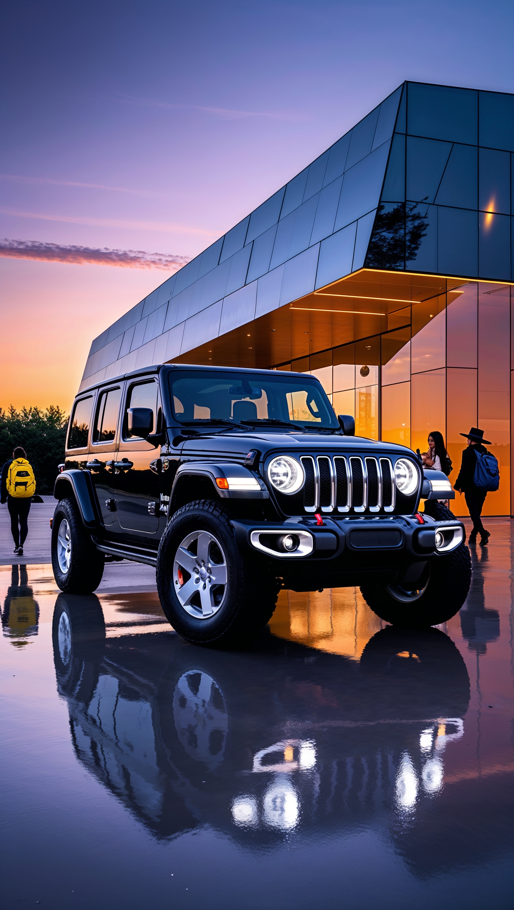 Jeep in front of a modern glass building at dusk 1664x2944 Jeep in front of a modern glass building at dusk