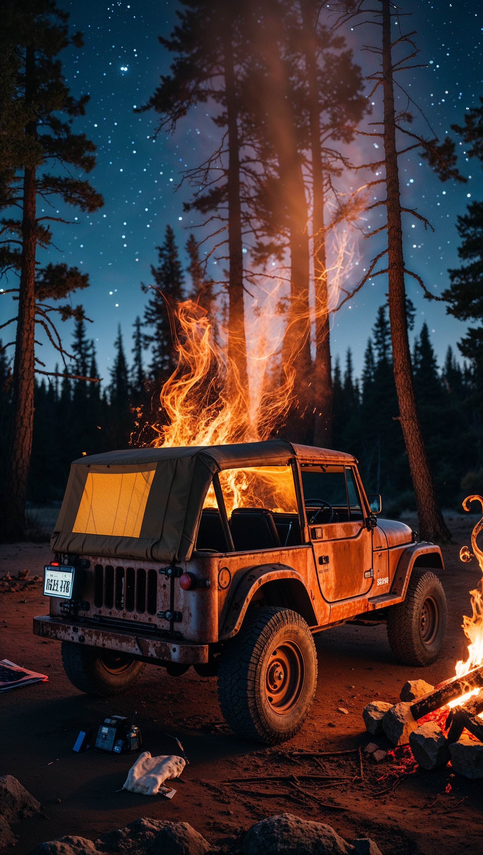 Jeep next to a campfire in the wilderness at night 1664x2944 Jeep next to a campfire in the wilderness at night