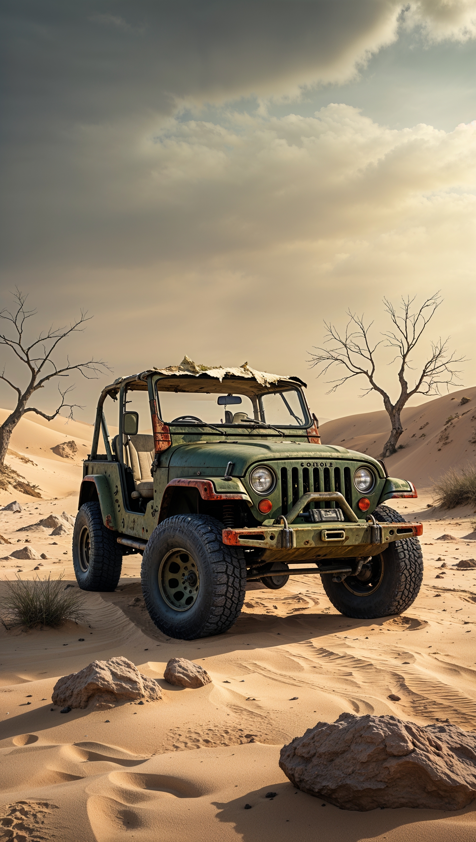 A classic army green Jeep in a desert warzone style 1664x2944 A classic army green Jeep in a desert warzone style