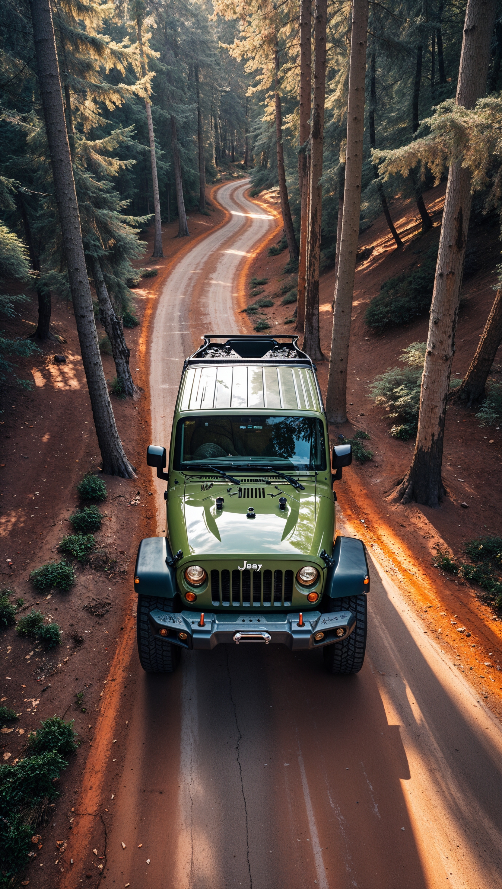 Top view of a Jeep on a winding forest road 1664x2944 Top view of a Jeep on a winding forest road