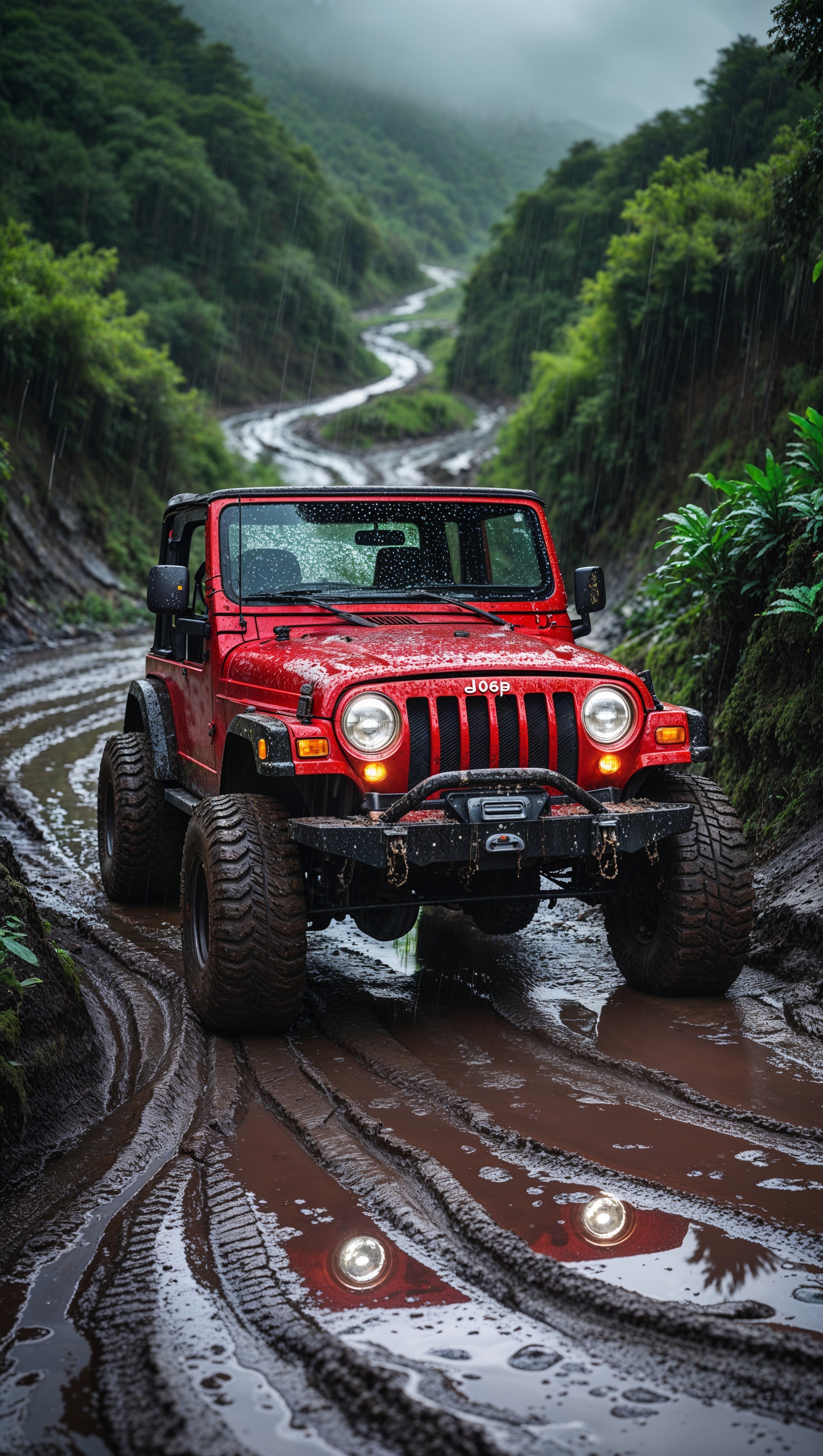 Red Jeep on a muddy trail after heavy rain 1664x2944 Red Jeep on a muddy trail after heavy rain