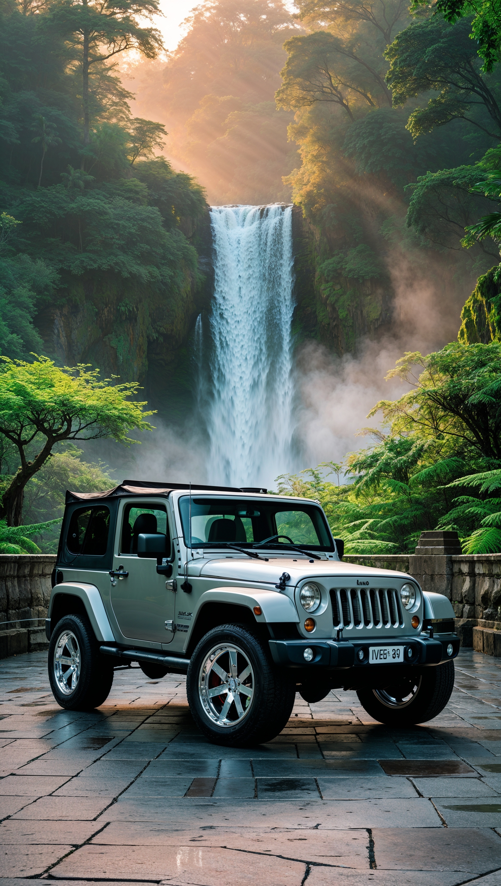 Jeep parked in front of a waterfall, lush green scenery 1664x2944 Jeep parked in front of a waterfall, lush green scenery