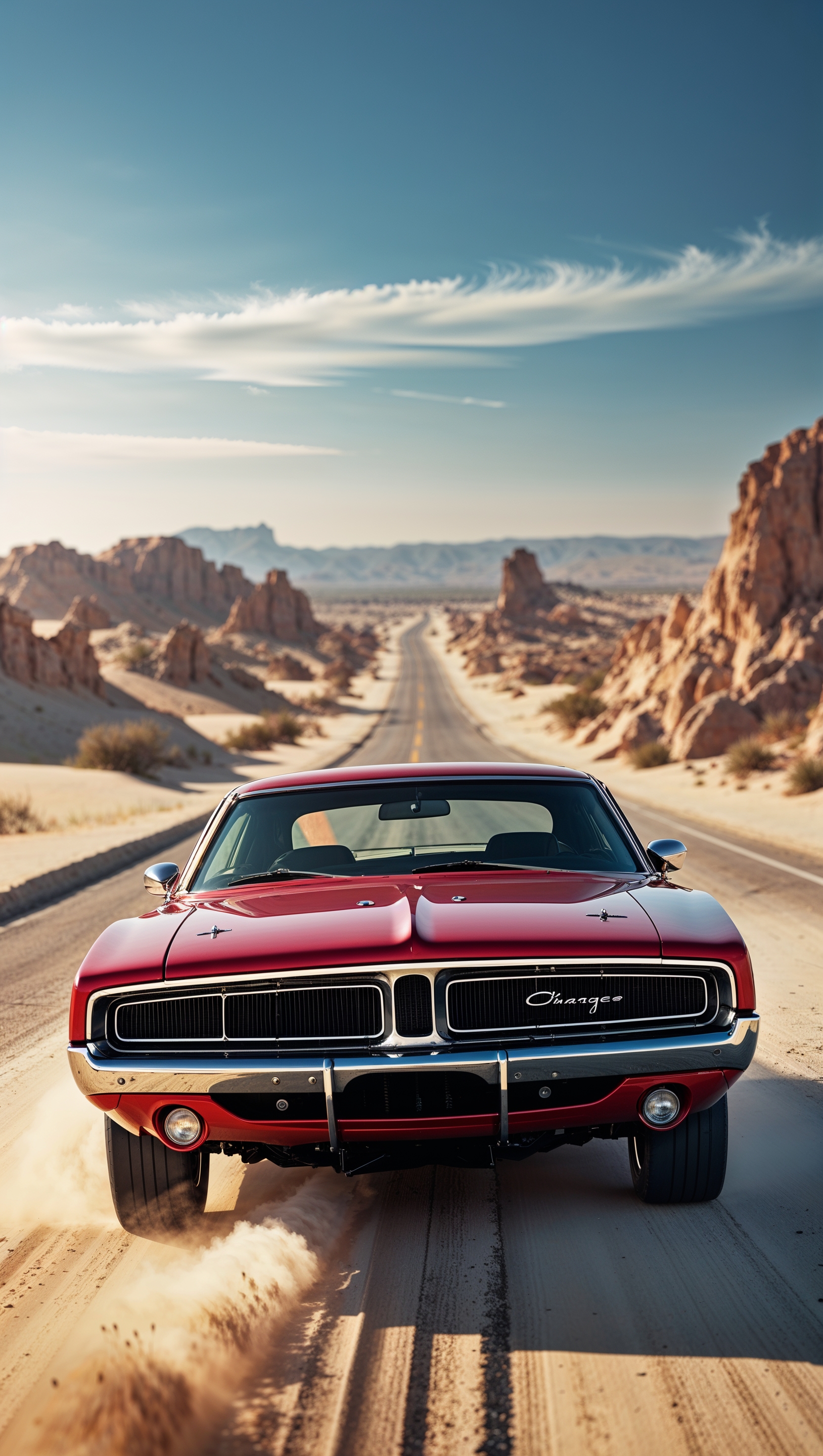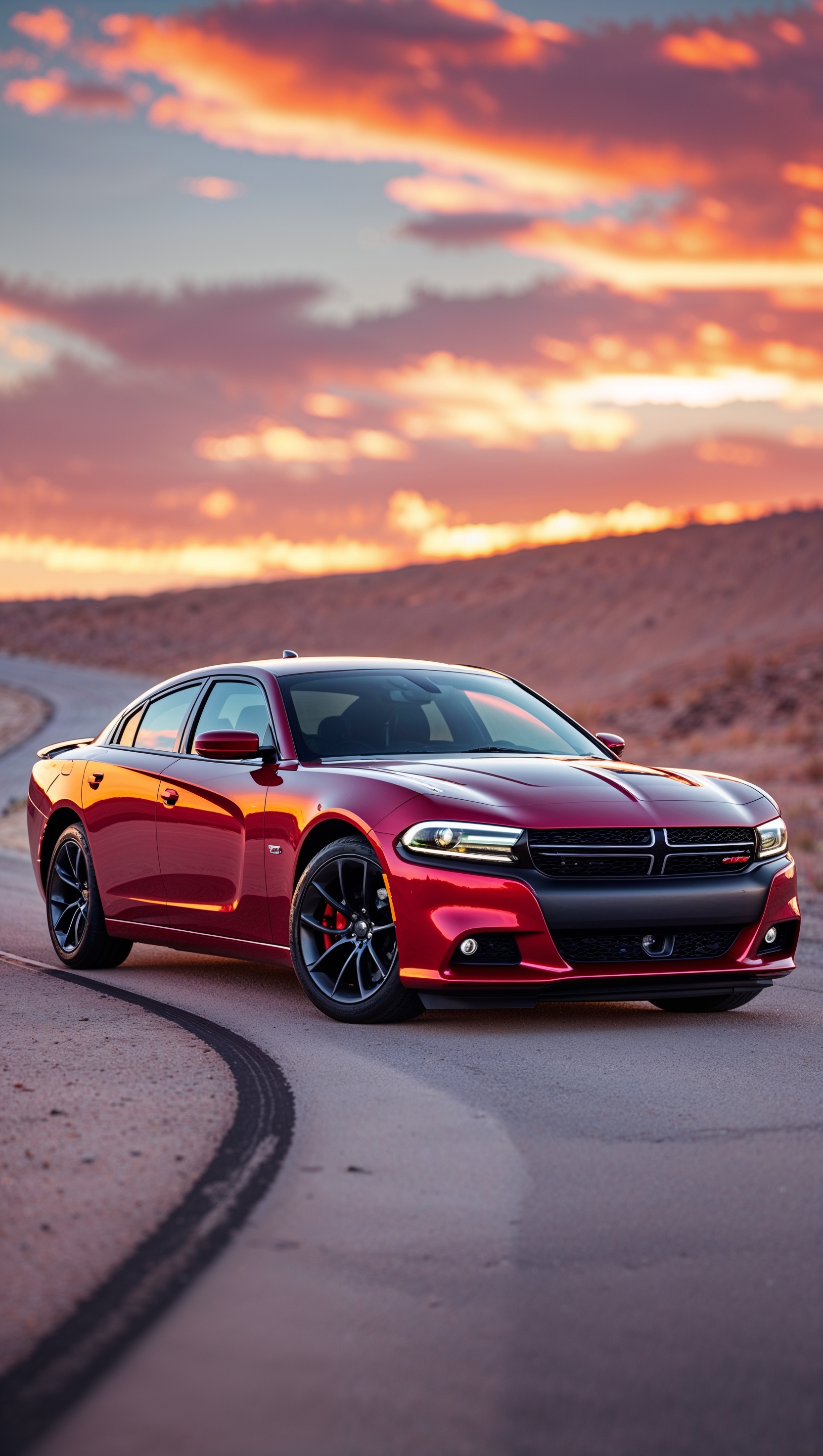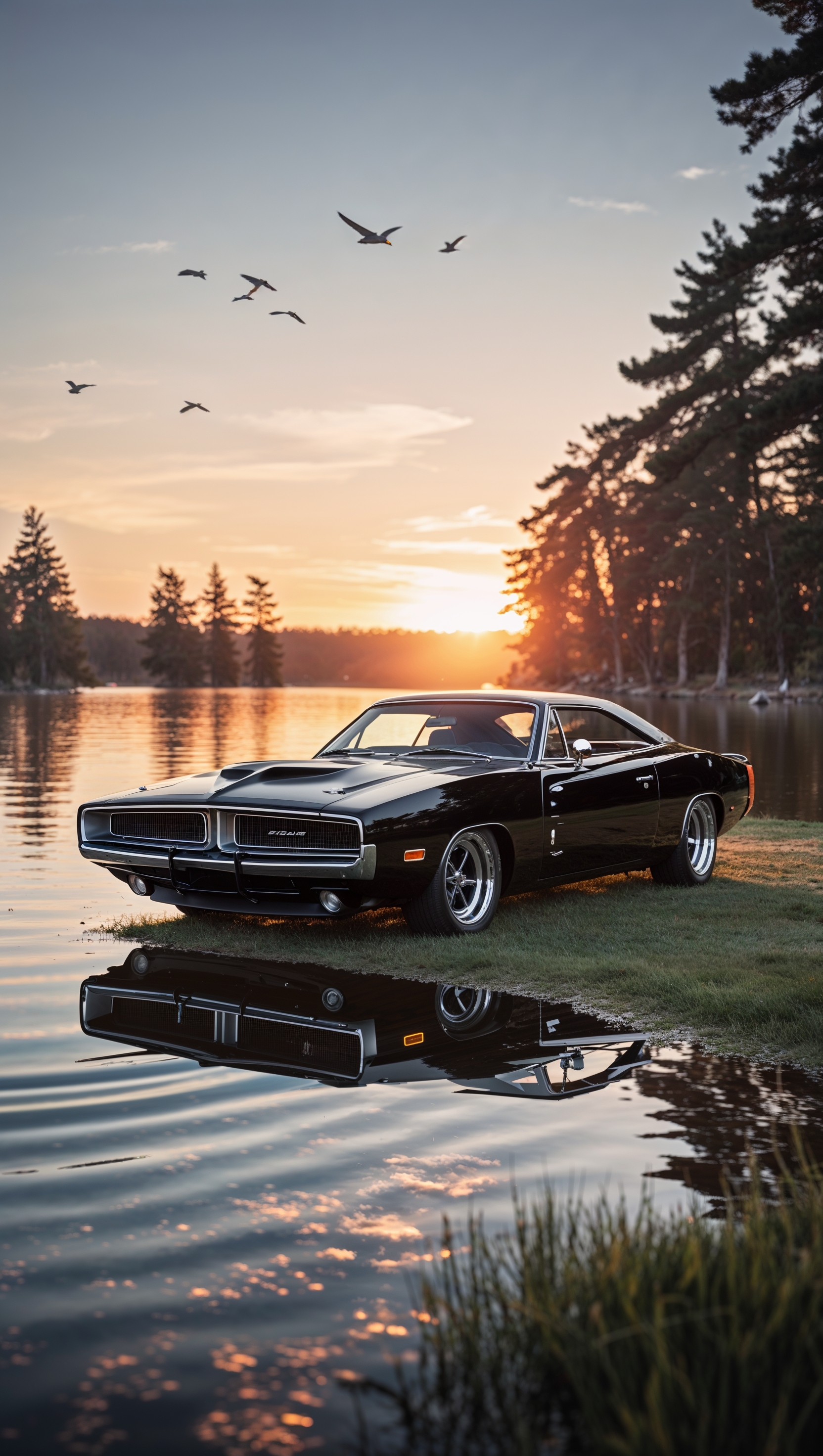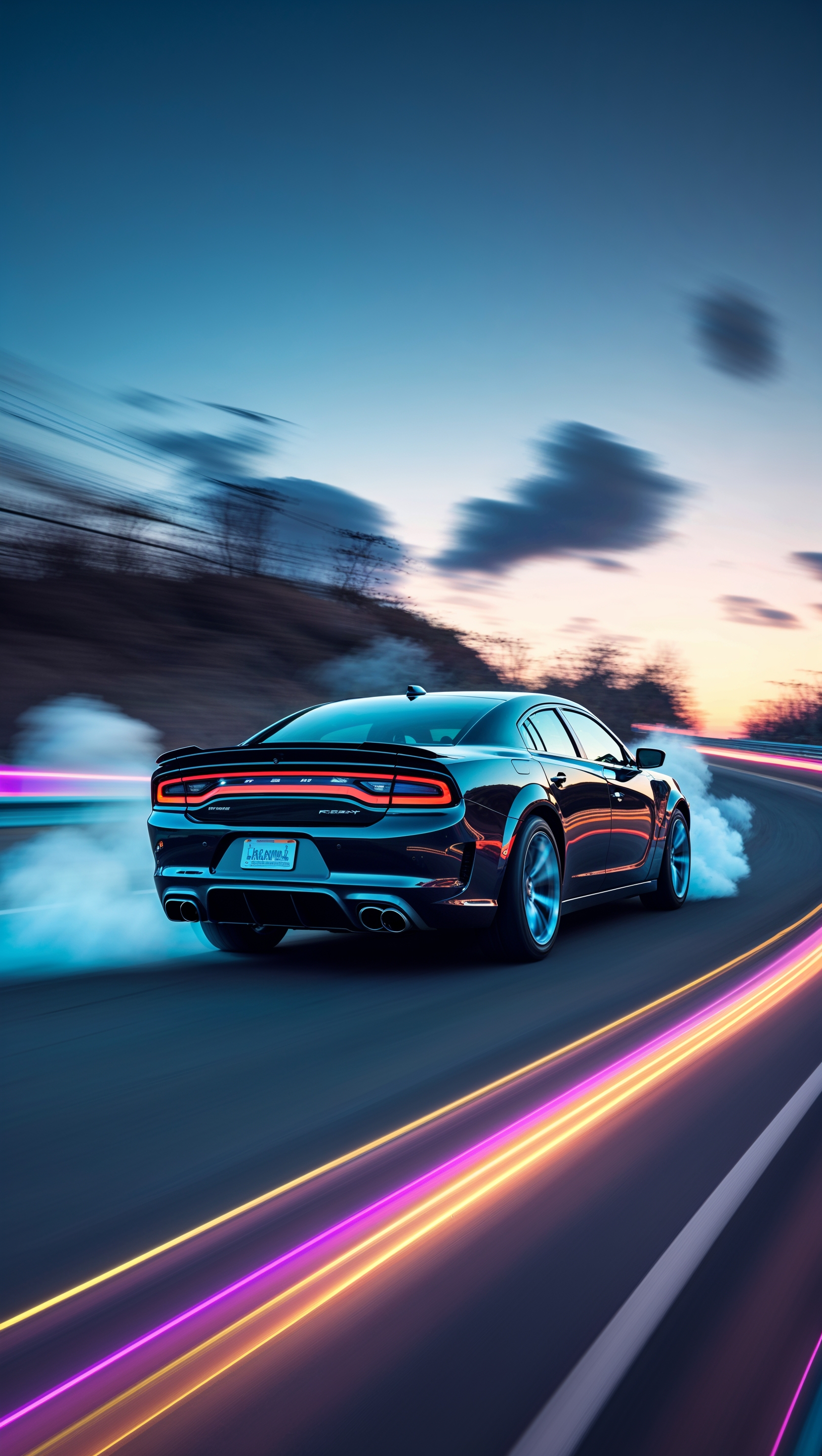1664x2944 A Dodge Charger at sunset with soft light in the background
