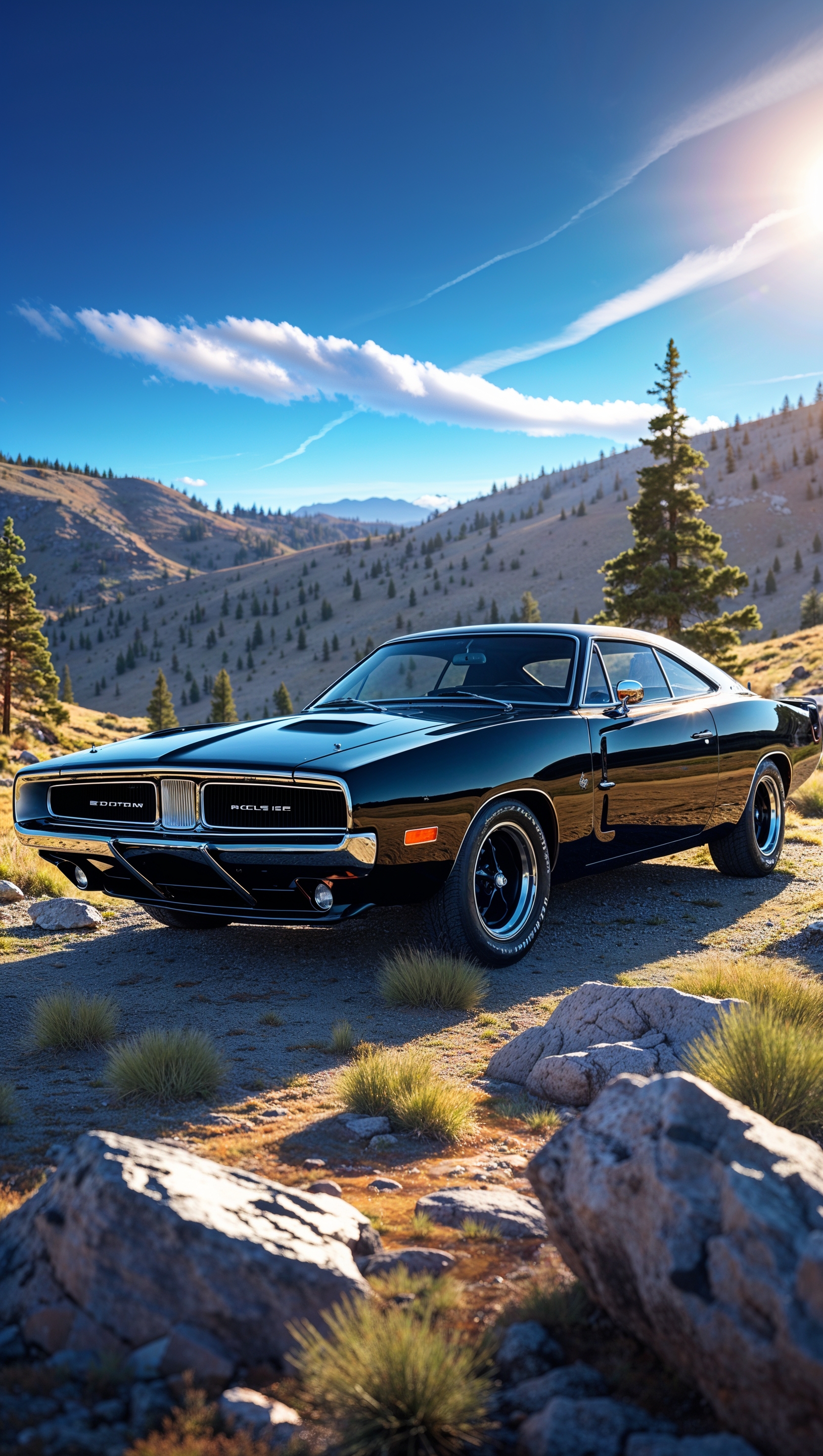 1664x2944 A black Dodge Charger in a mountainous landscape with a blue sky