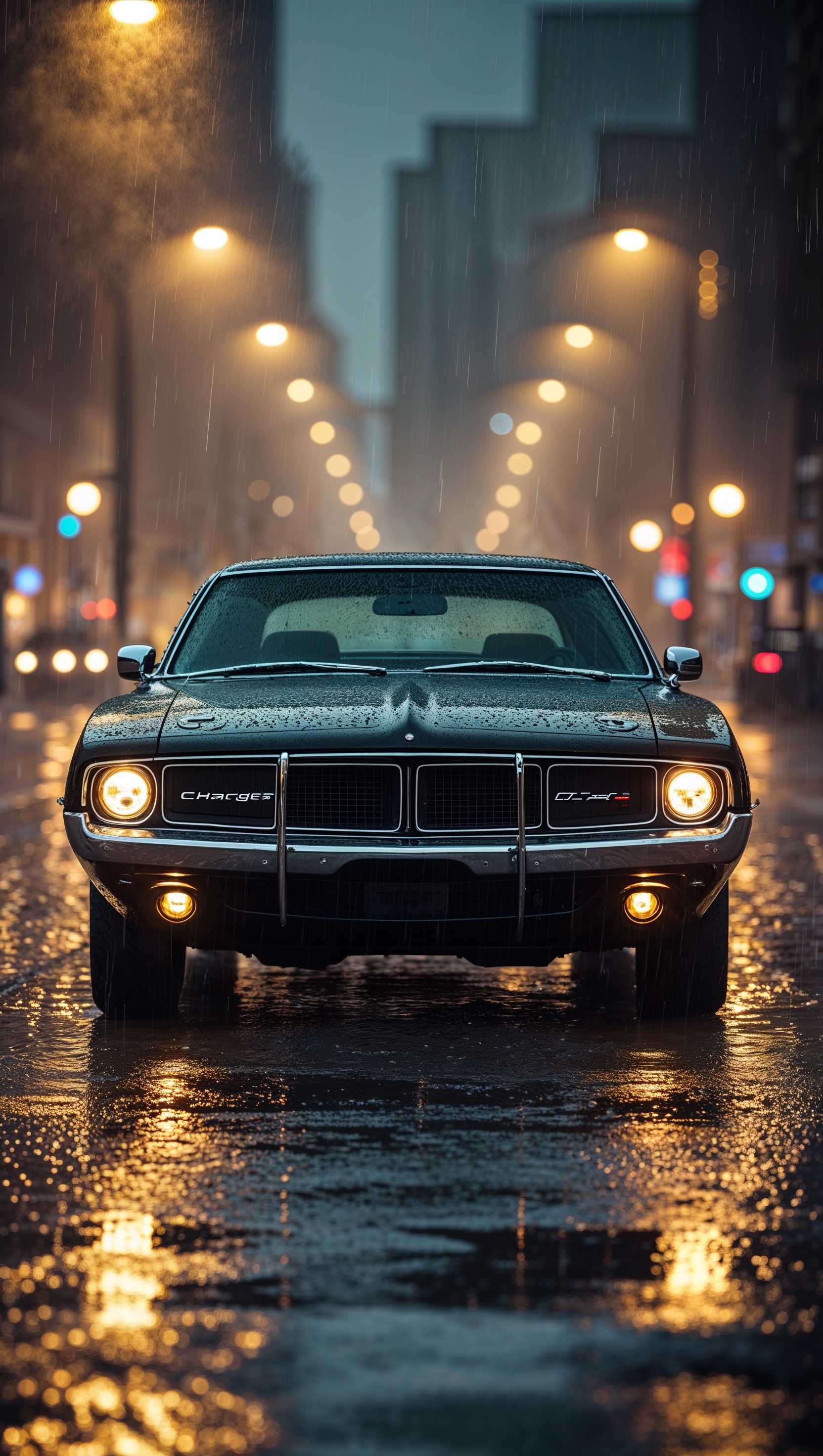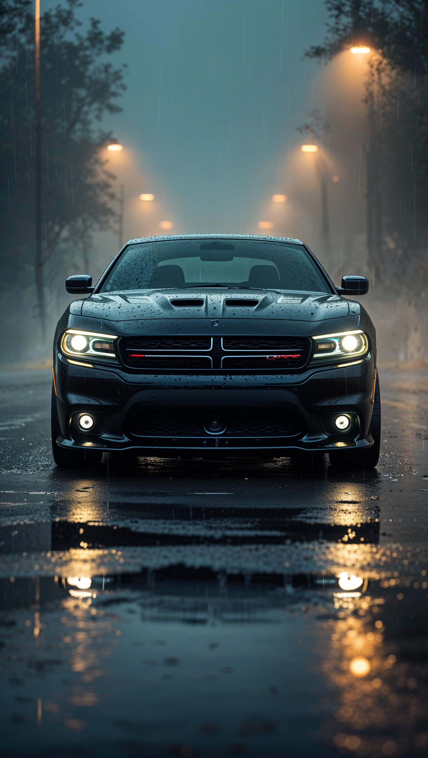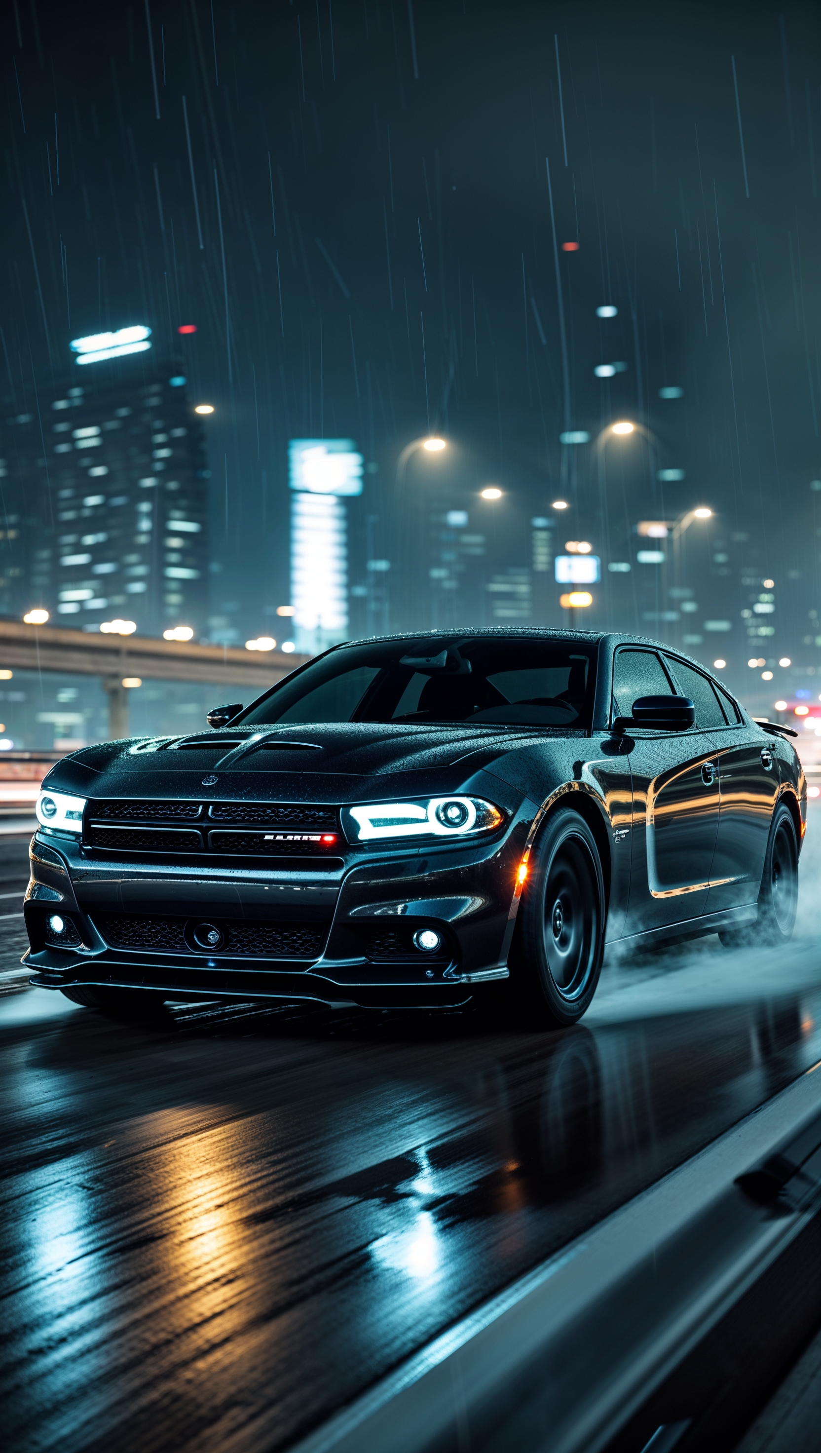 1664x2944 A Dodge Charger on a rainy street with falling rain and street lights