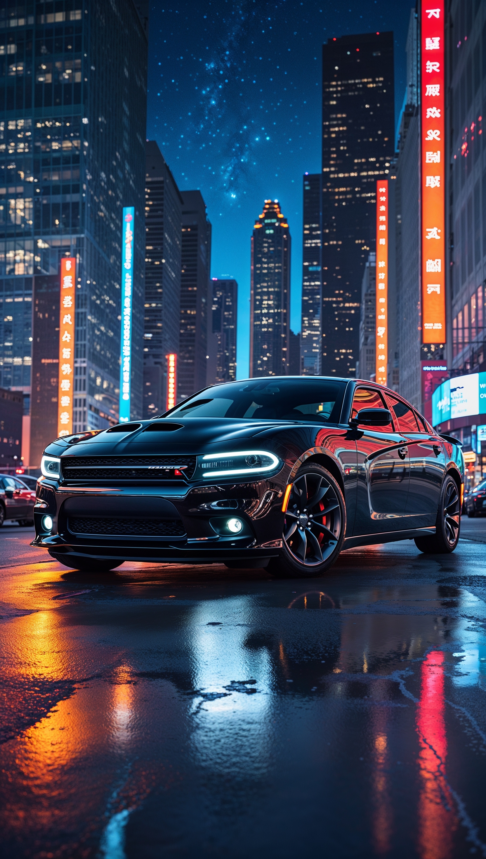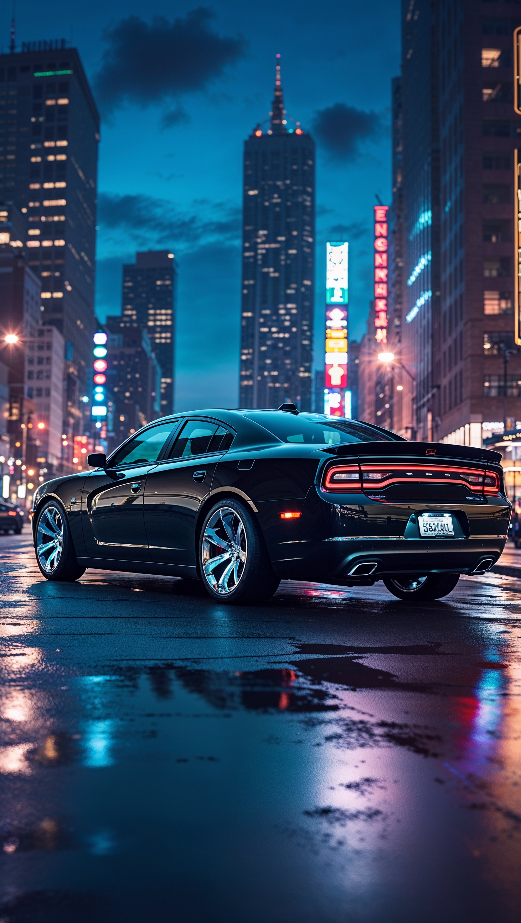 1664x2944 A Dodge Charger next to urban skyscrapers with night lighting