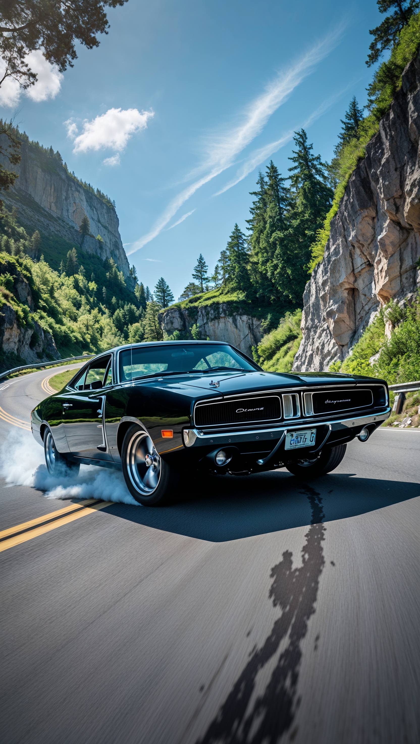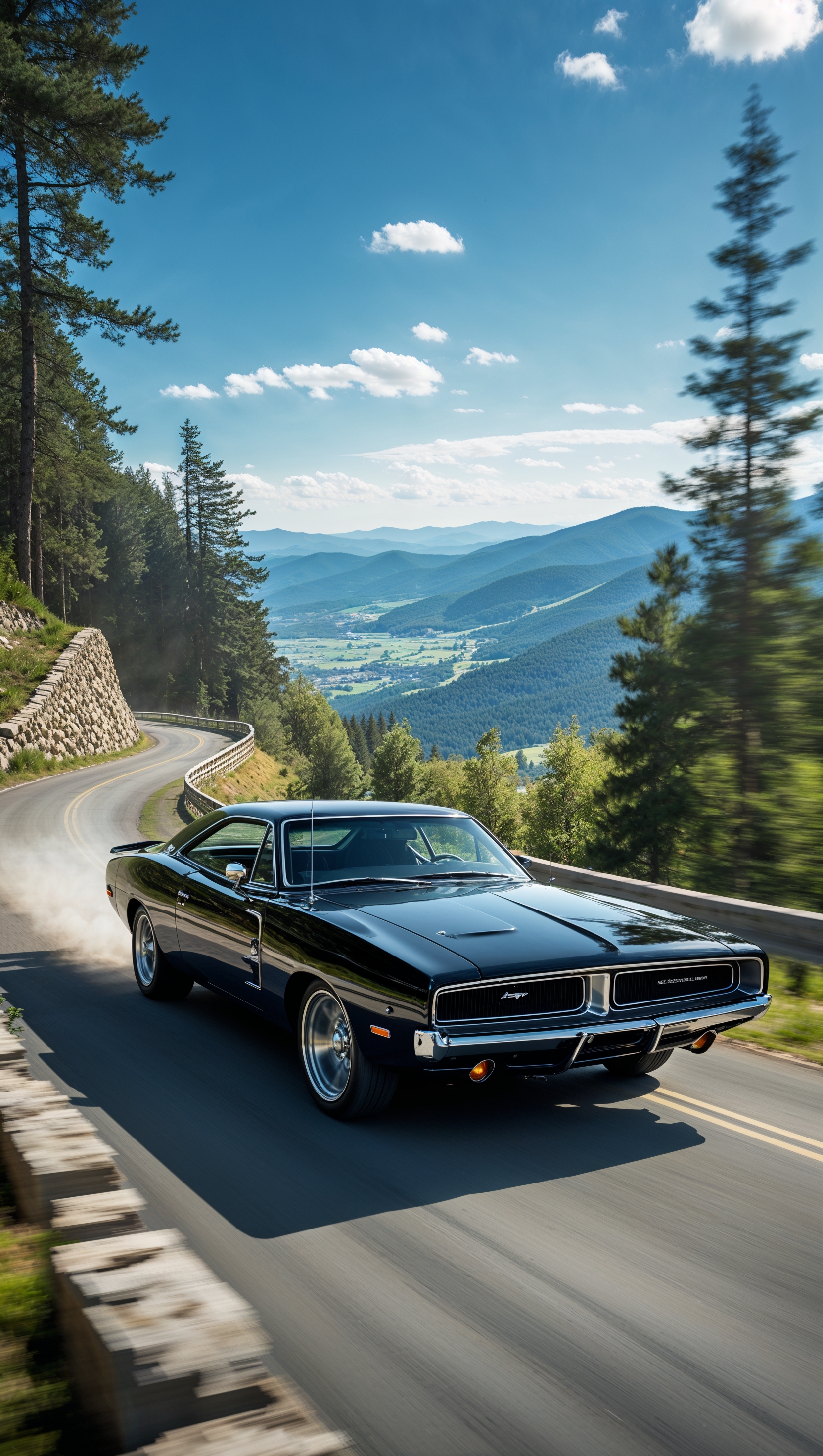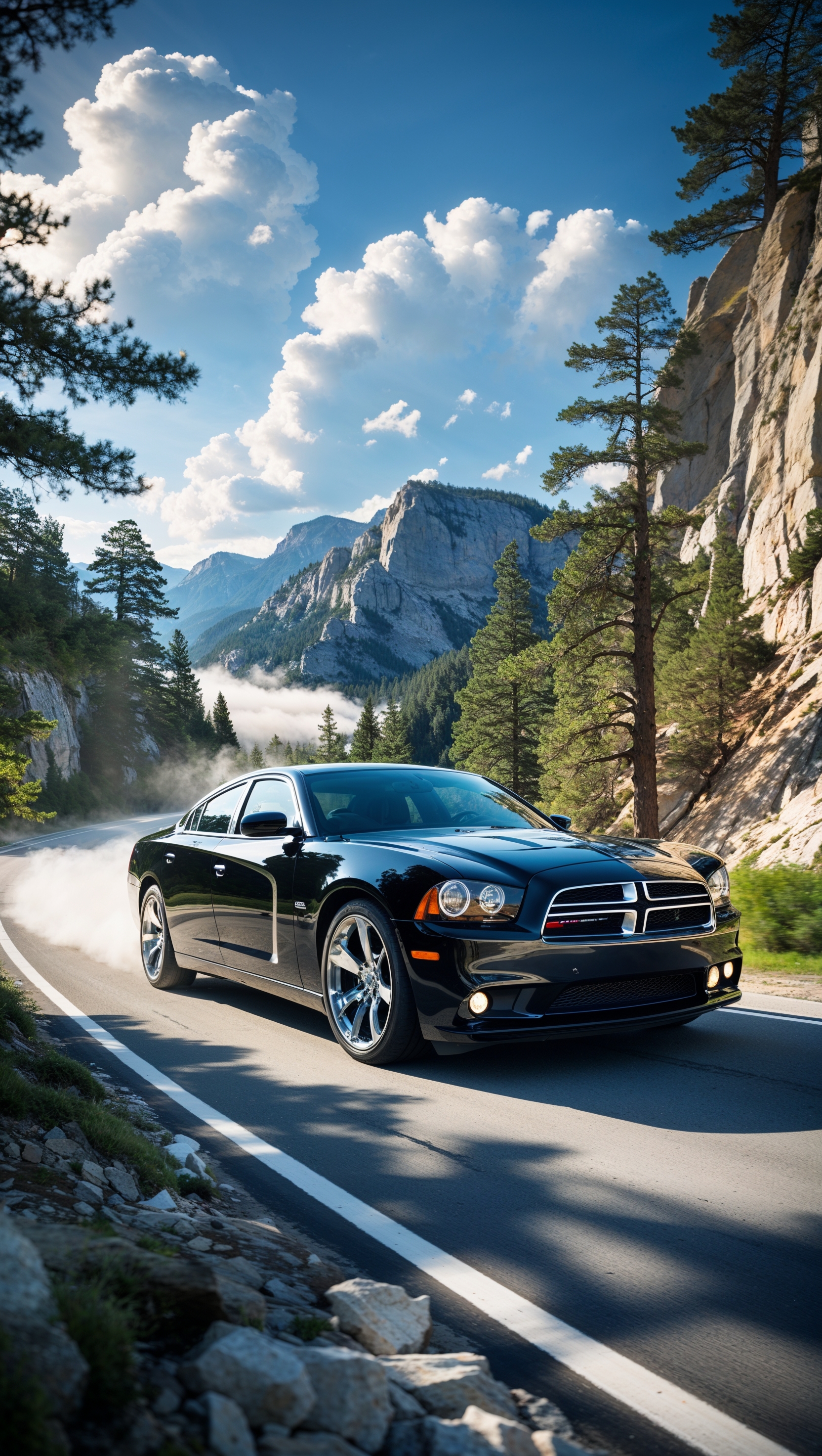 1664x2944 A Dodge Charger on a mountain road in bright daylight