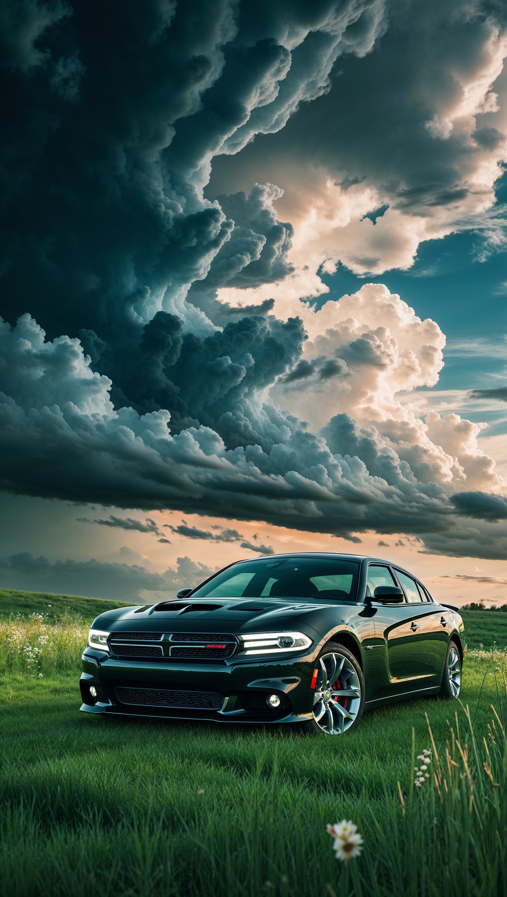 1664x2944 A Dodge Charger in a field with a sky full of dark clouds