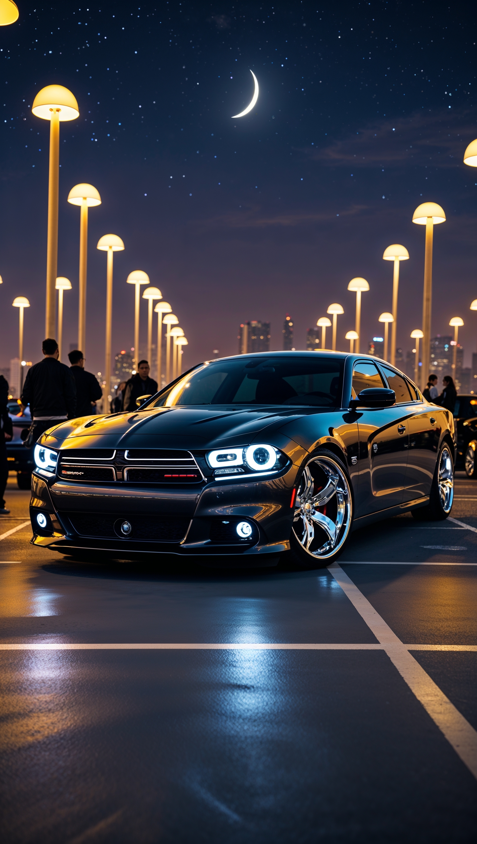 1664x2944 A Dodge Charger in a modern parking lot with beautiful night lighting
