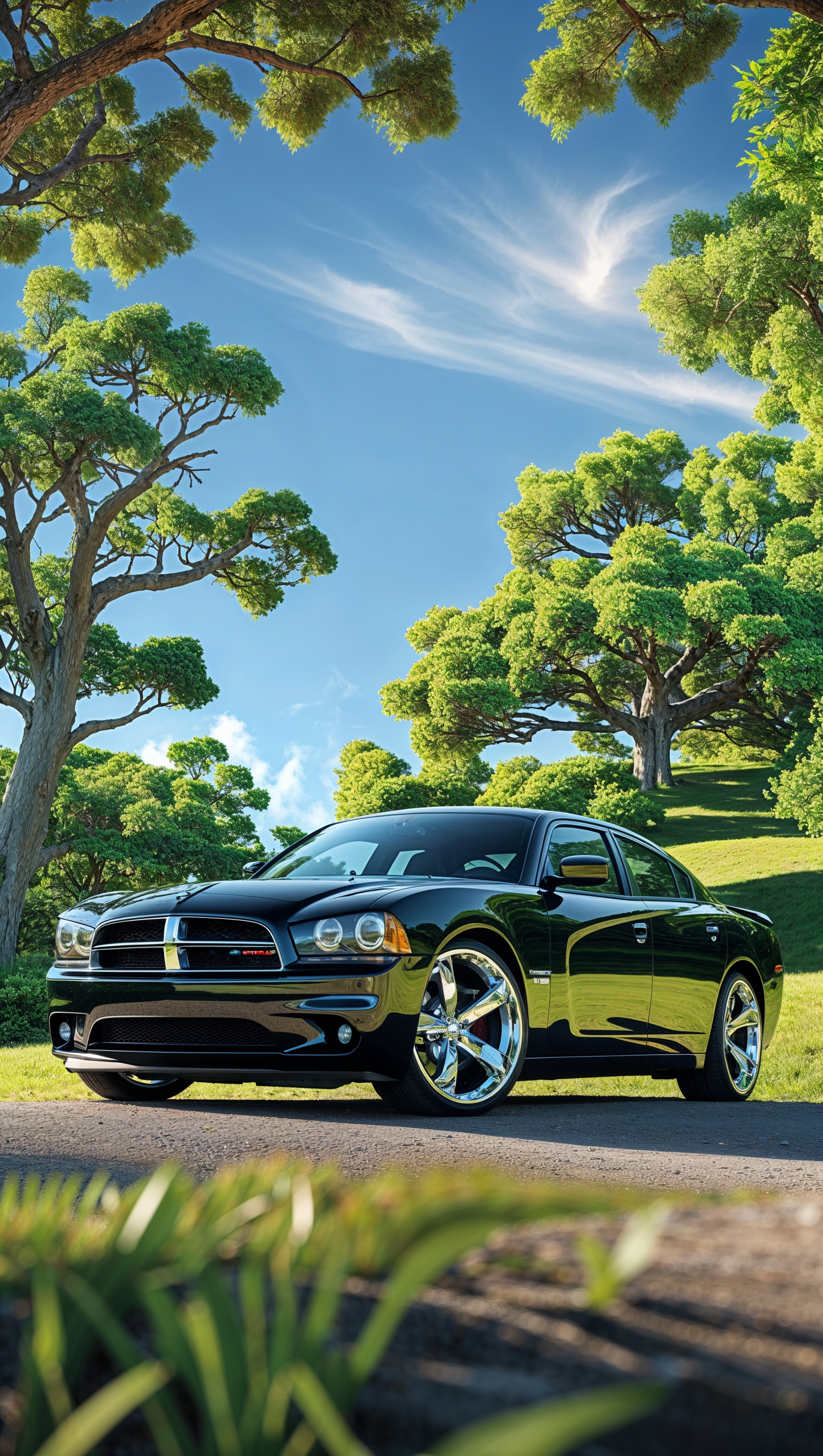 1664x2944 A Dodge Charger next to green trees with a blue sky