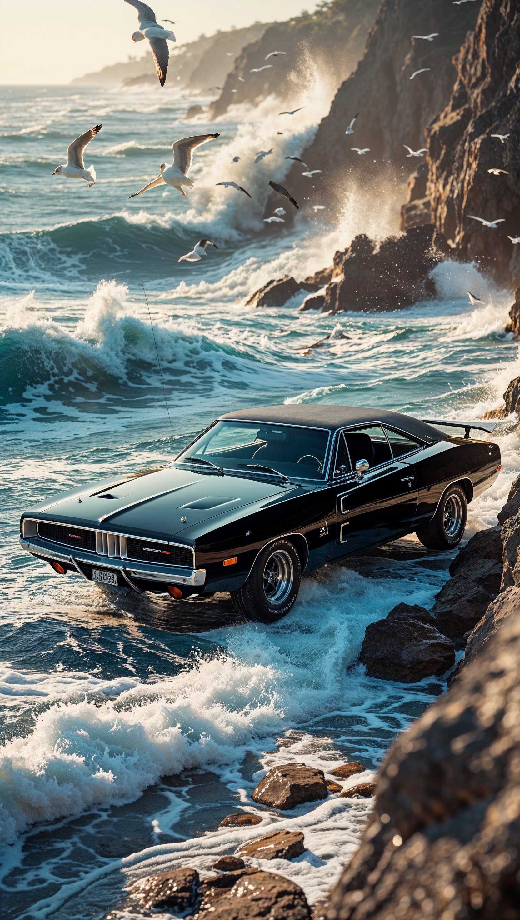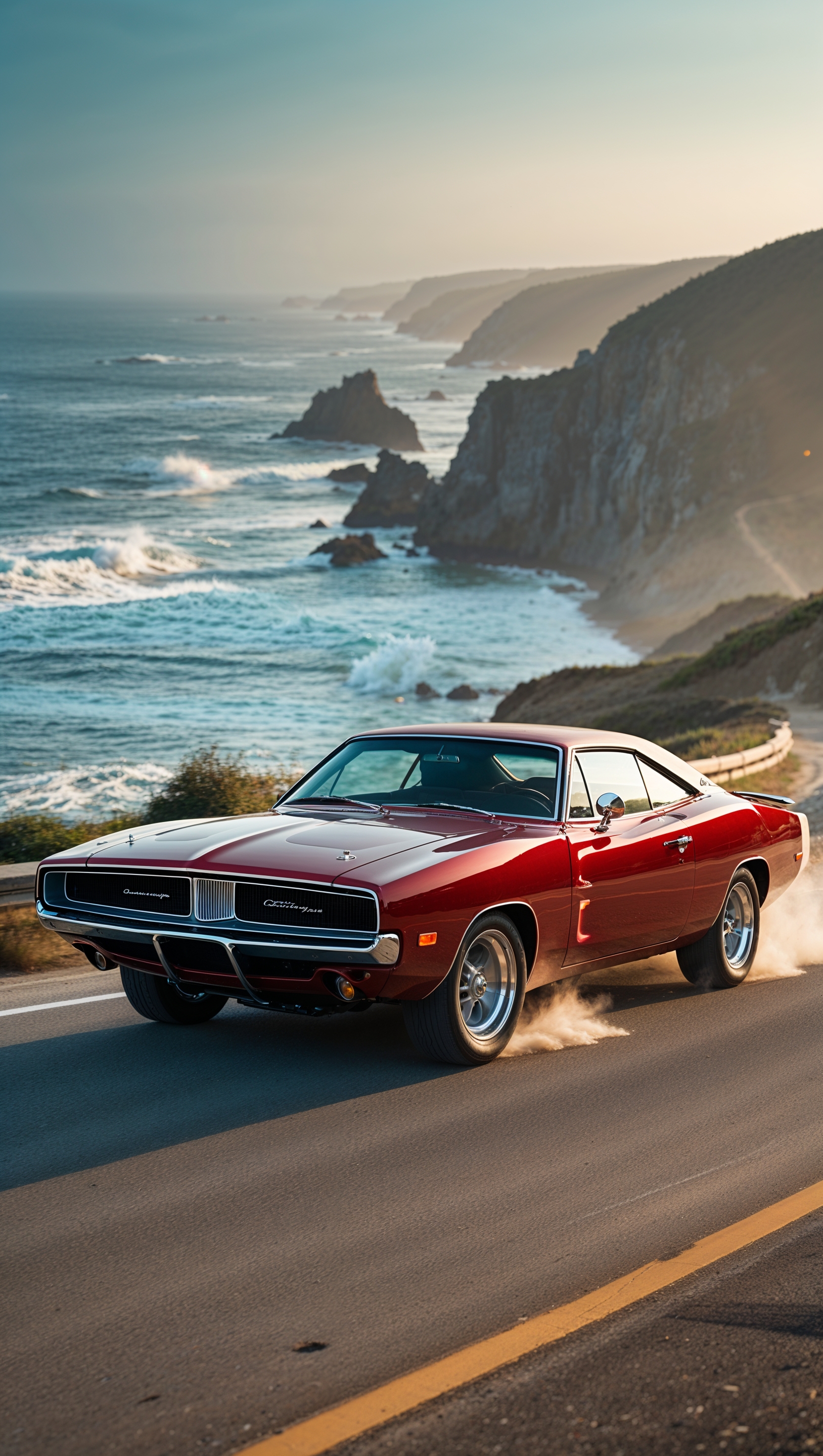1664x2944 A Dodge Charger on a coastal road with ocean waves in the background