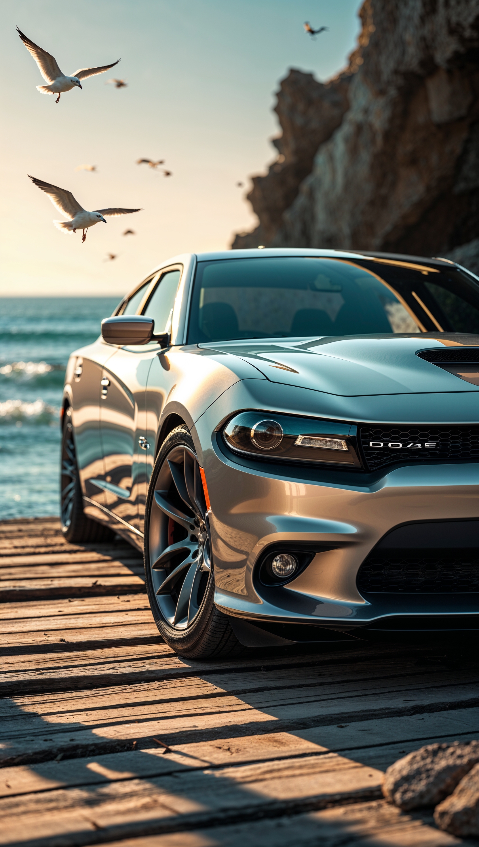 1664x2944 A close-up of a metallic Dodge Charger near the sea
