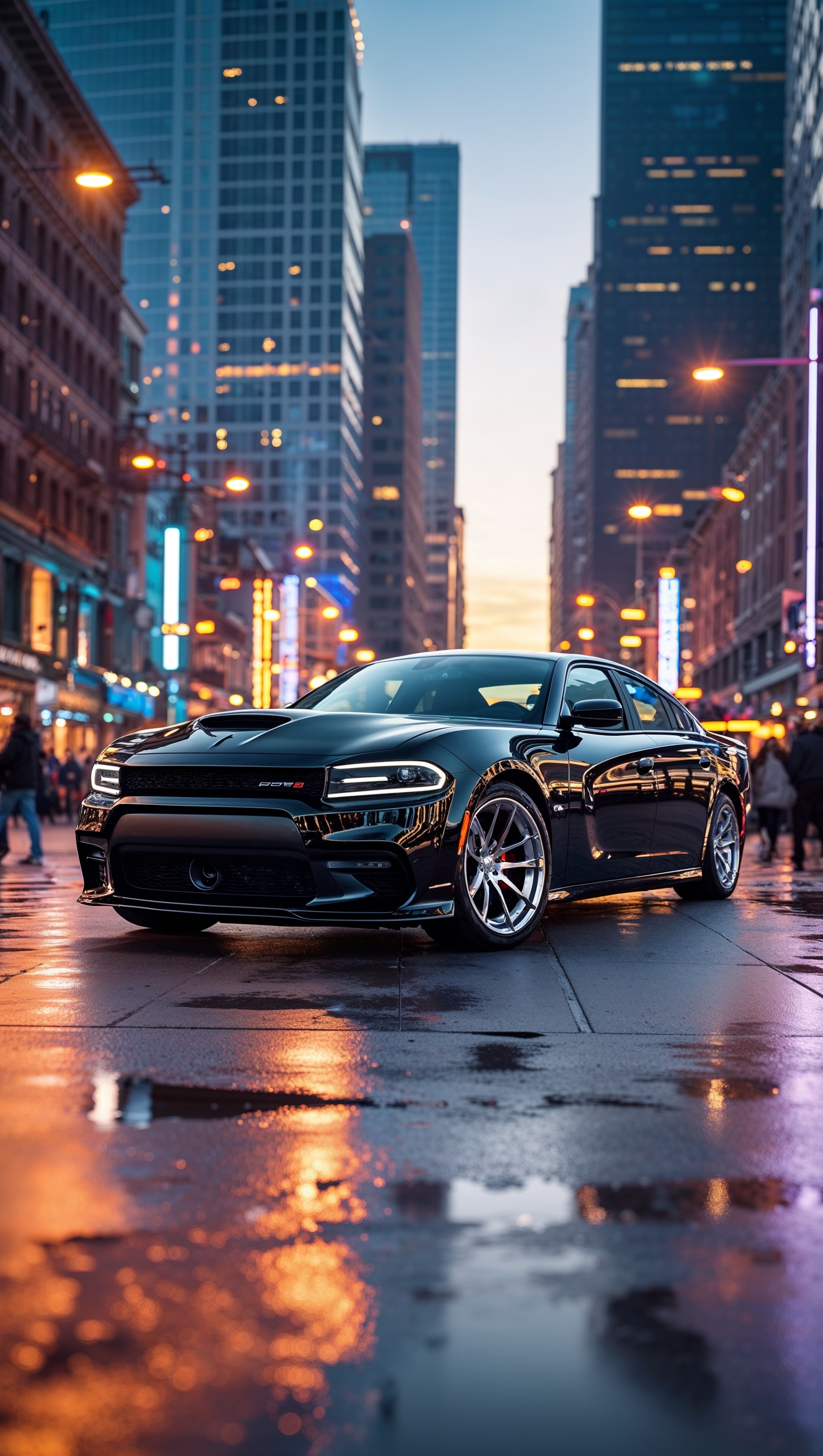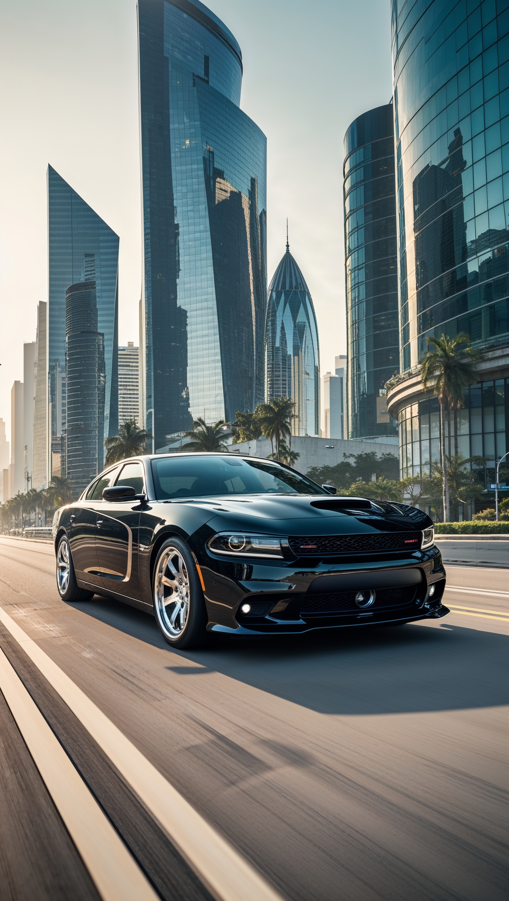 1664x2944 A Dodge Charger on a road with an urban skyline and modern buildings
