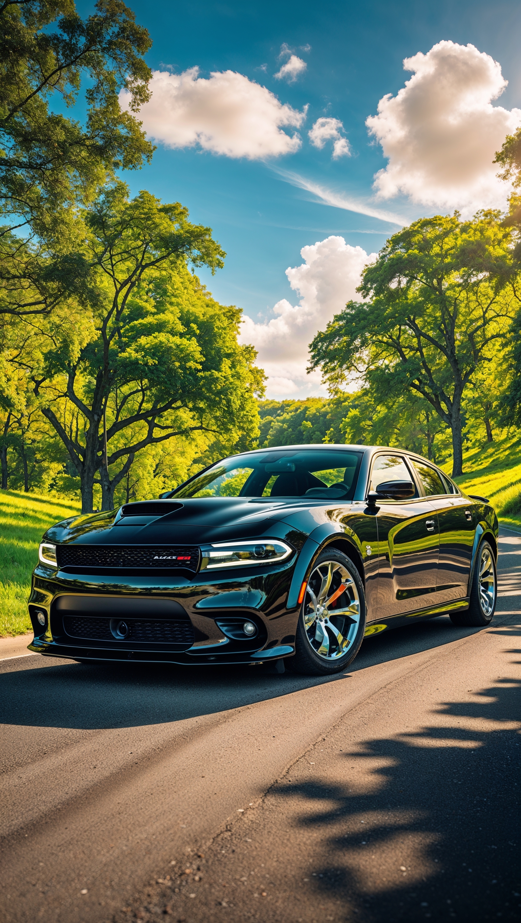 1664x2944 A Dodge Charger in a sunny day with green trees in the background