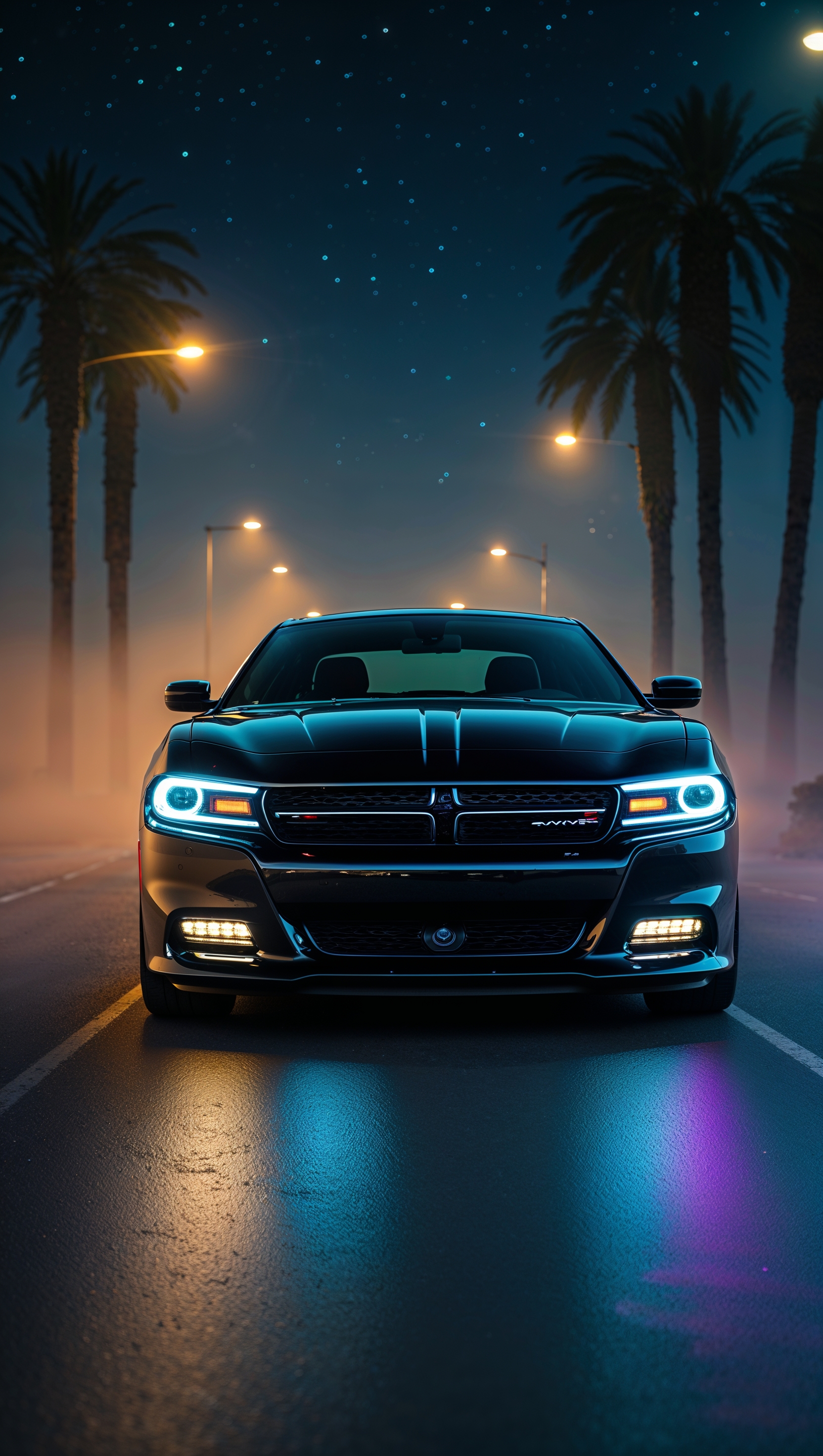 1664x2944 A Dodge Charger in an urban square with bright street lights