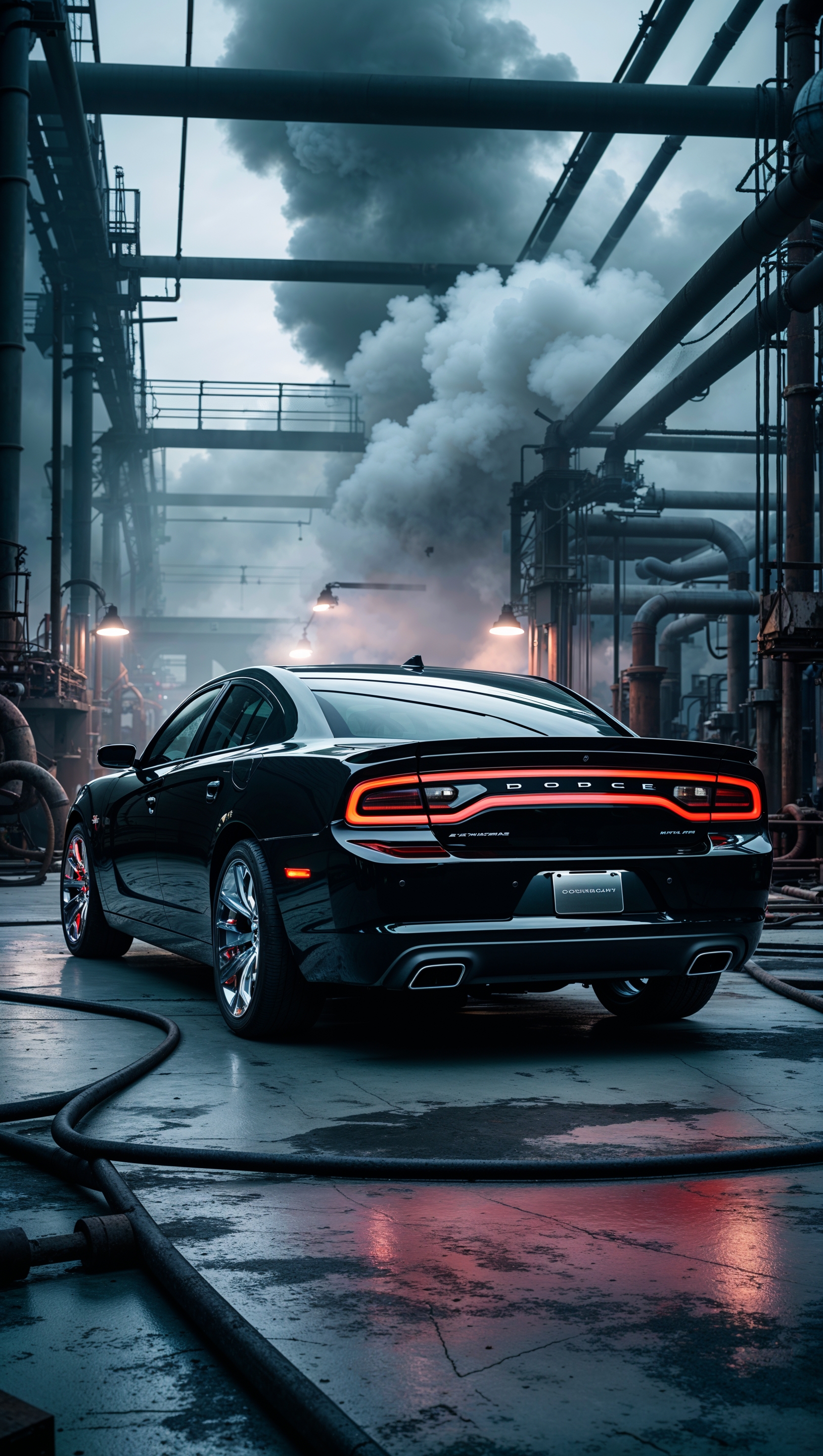 1664x2944 A Dodge Charger in an industrial area with smoke and steam in the background