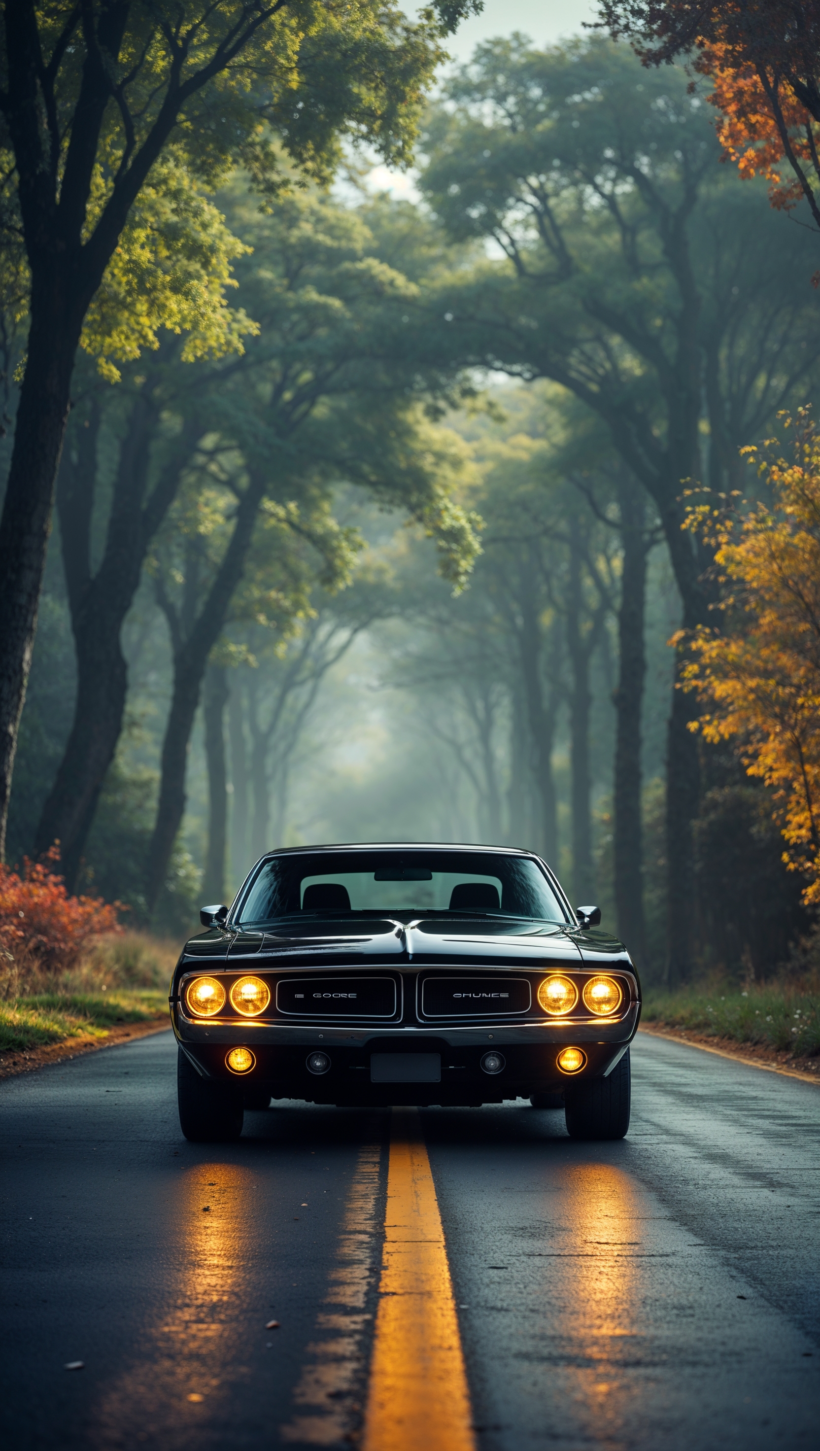 1664x2944 A Dodge Charger on a narrow road with tall trees on both sides