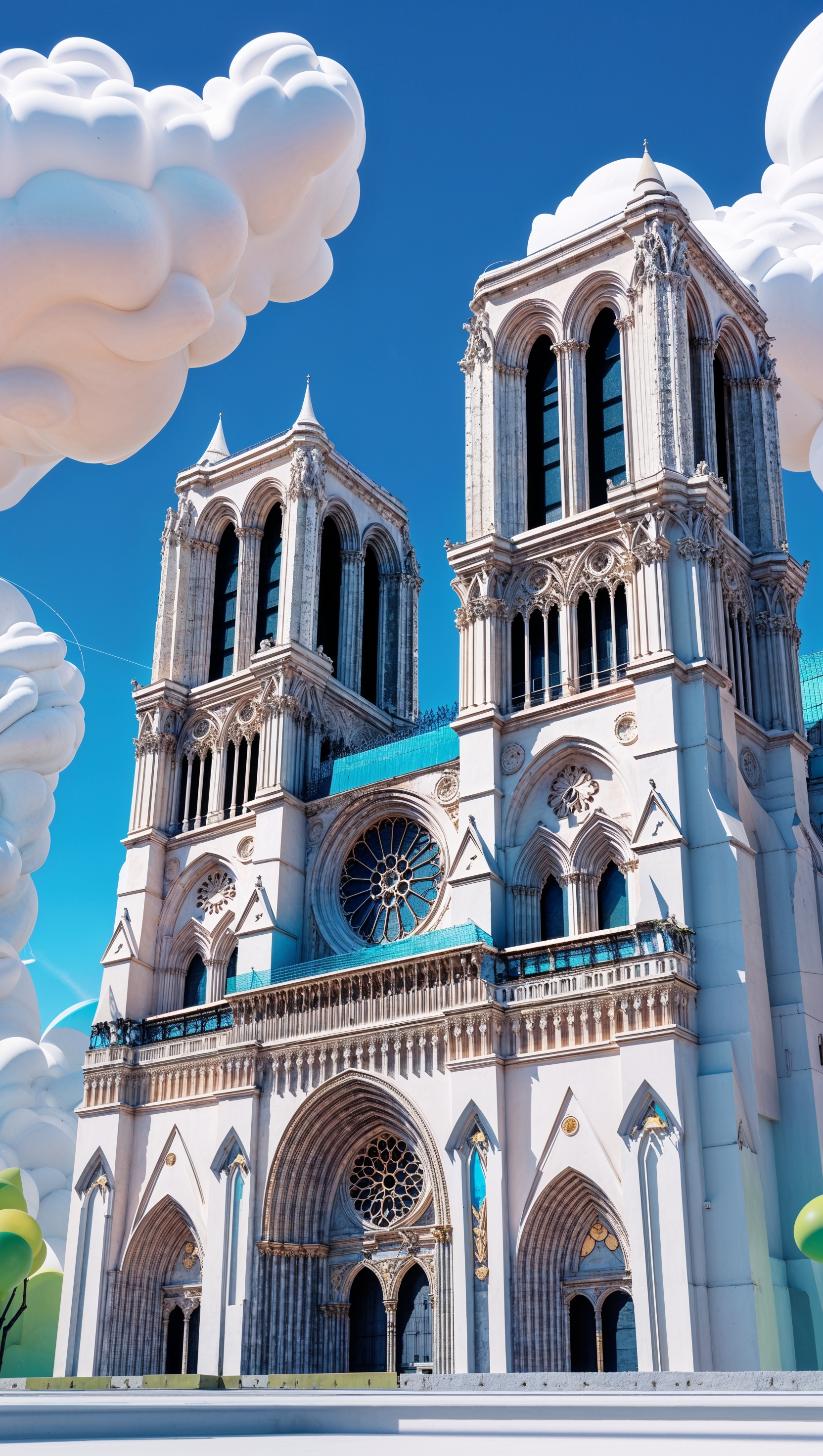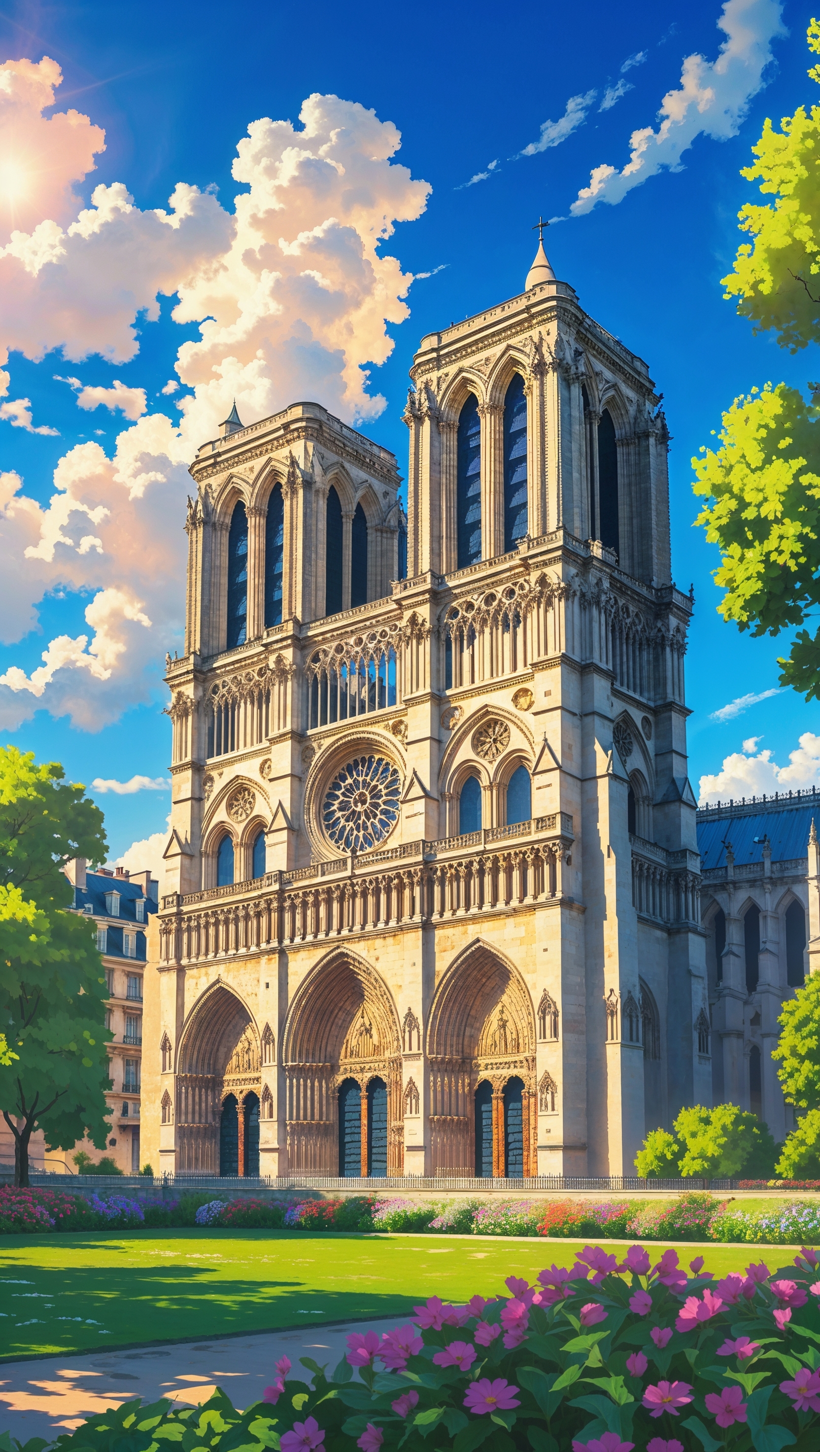 1664x2944 Notre Dame in summer with blue sky and white clouds