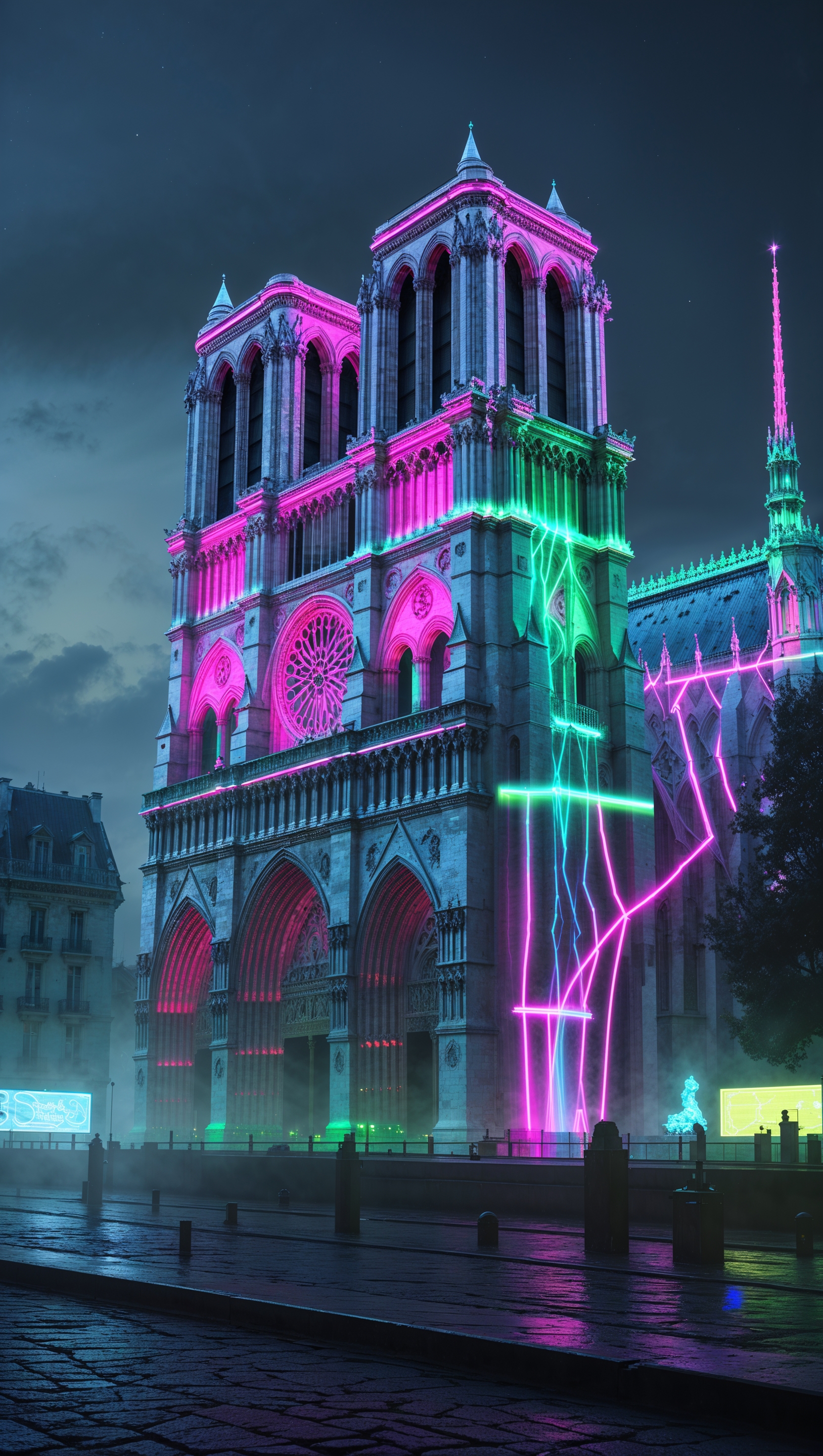1664x2944 Cyberpunk style Notre Dame with neon lights