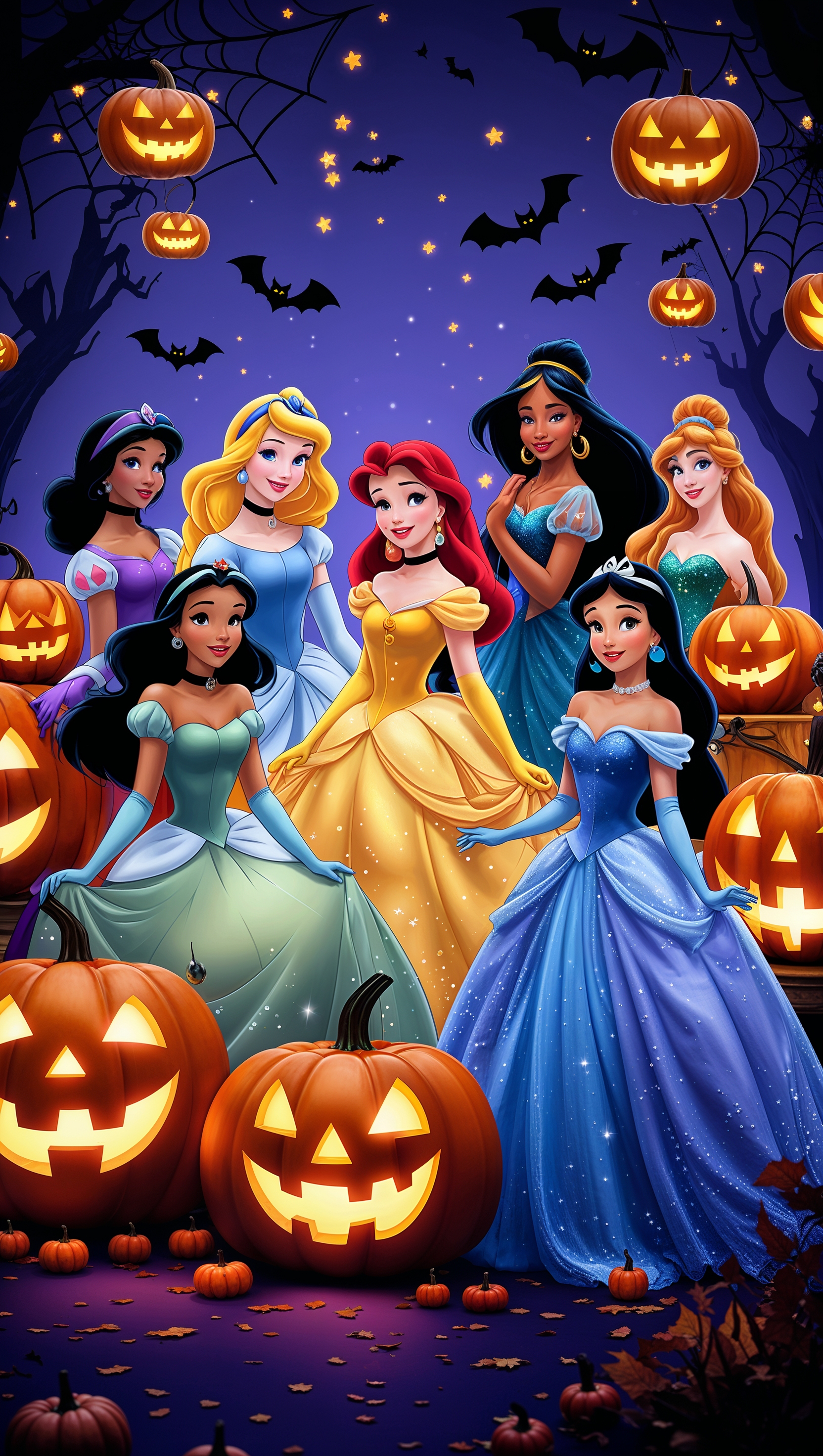 1664x2944 Disney princesses at a Halloween party with jack-o'-lanterns
