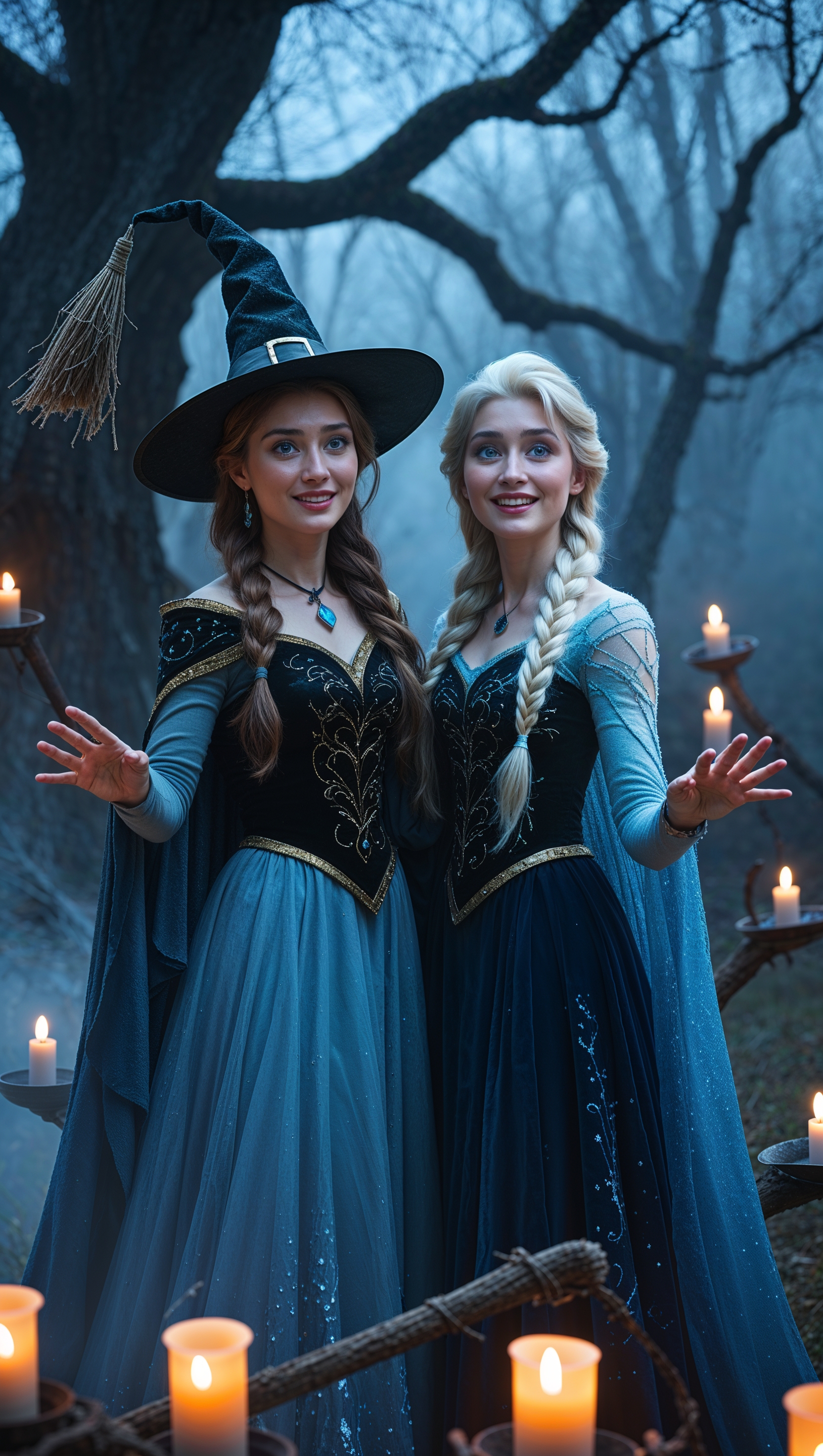 1664x2944 Anna and Elsa dressed as witches on a dark night