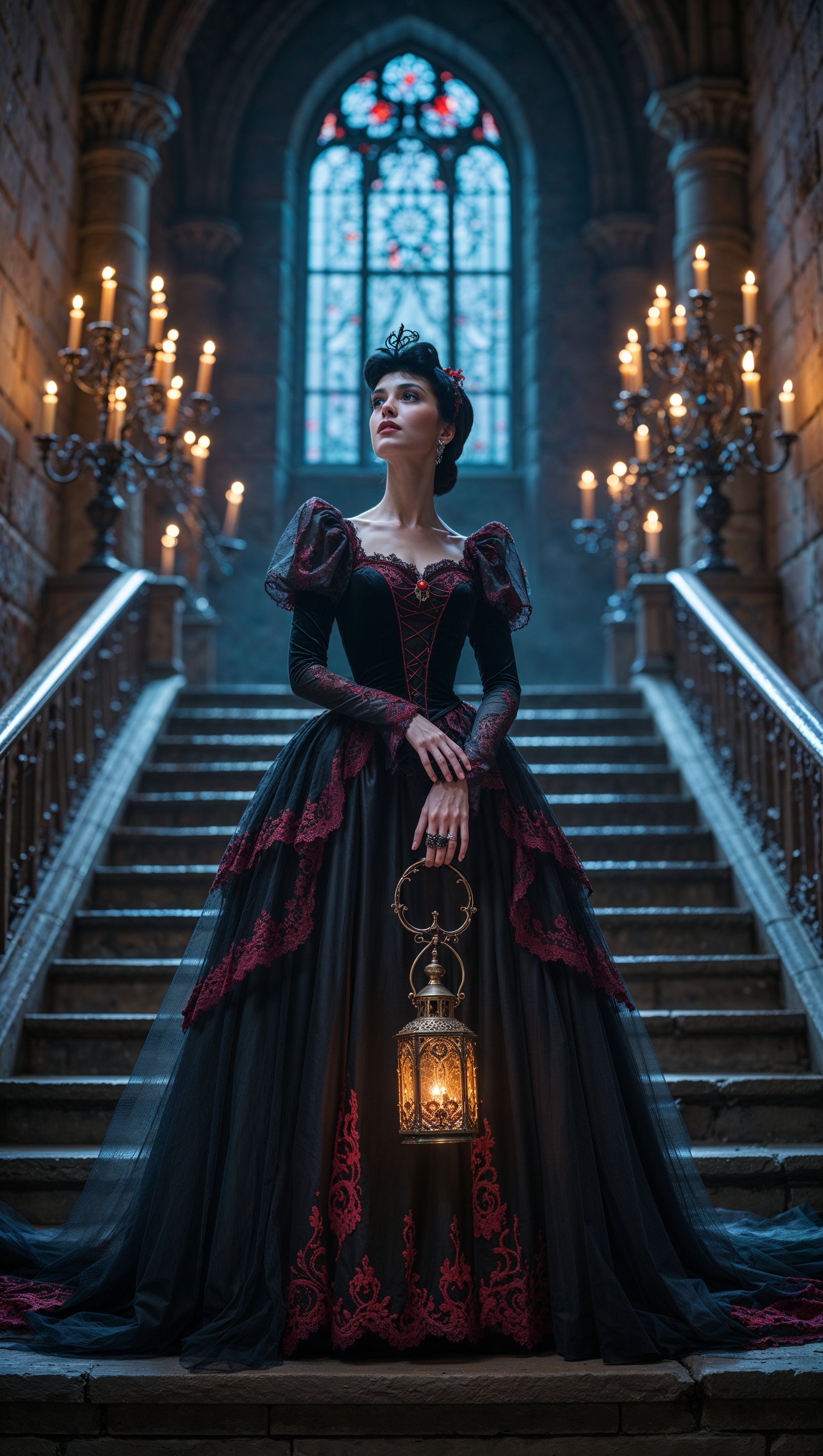 1664x2944 Cinderella in a dark Halloween dress on castle stairs
