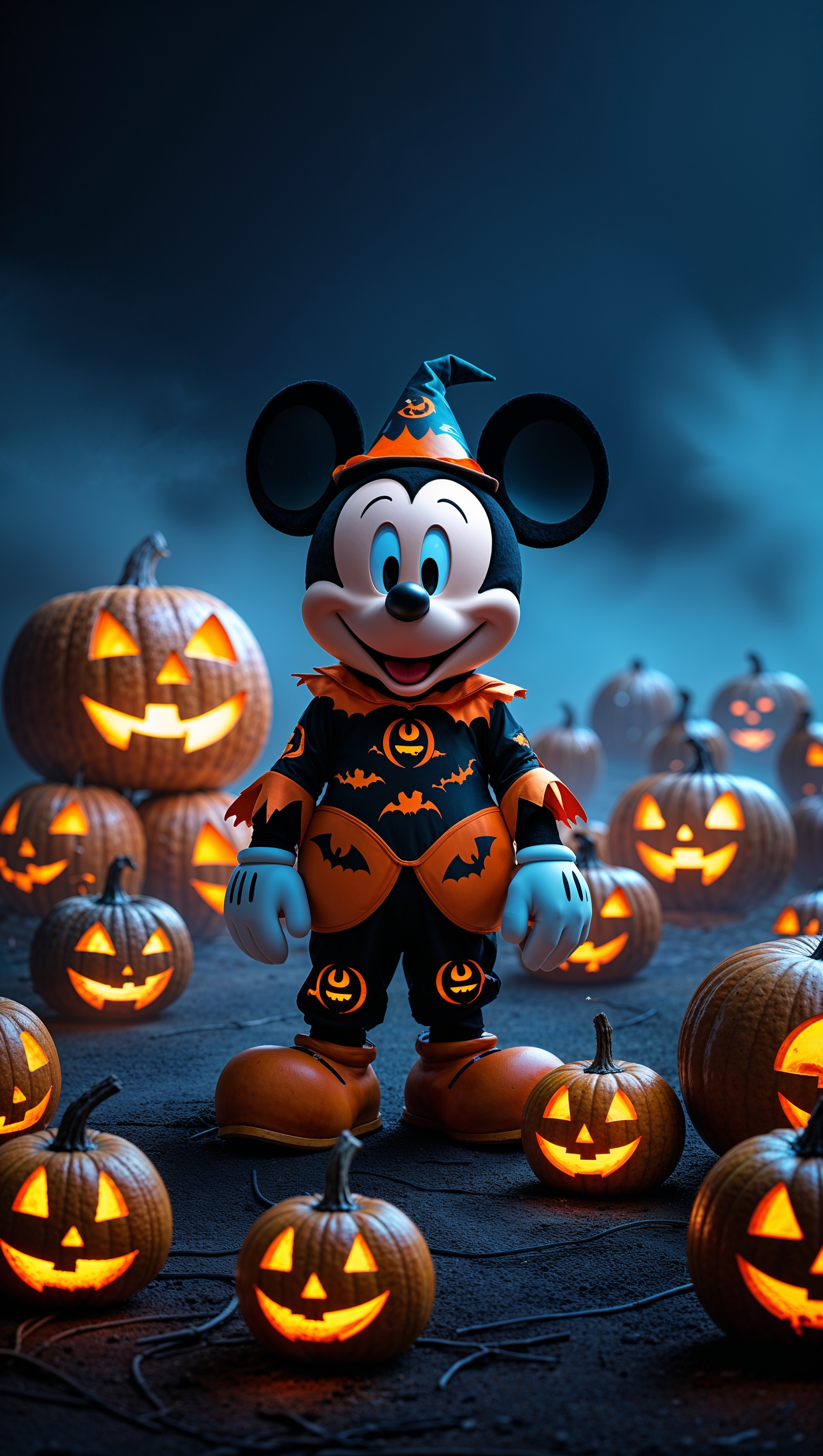 1664x2944 Mickey Mouse in a Halloween costume on a dark night with pumpkins