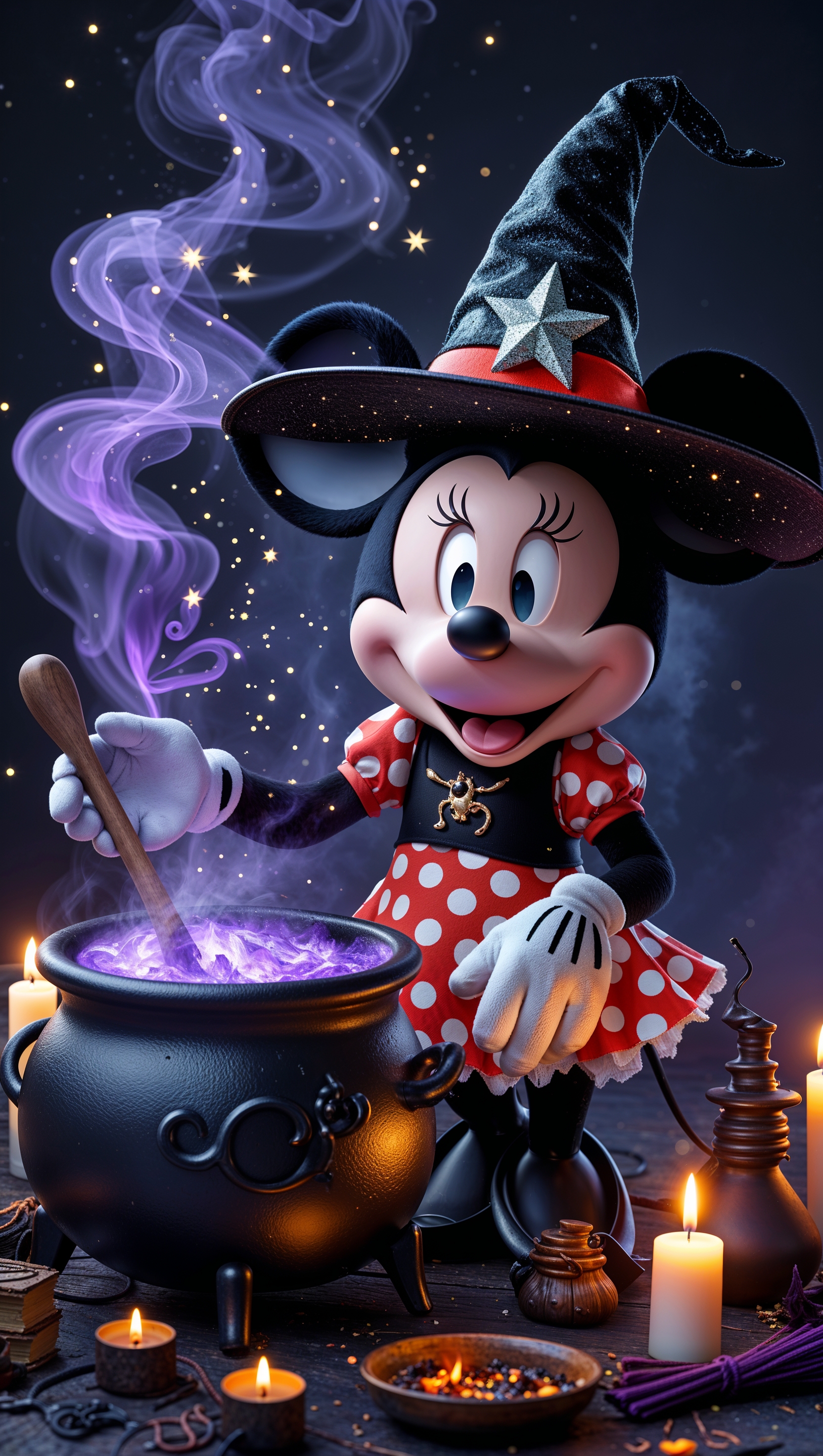 1664x2944 Minnie Mouse dressed as a witch next to a bubbling cauldron