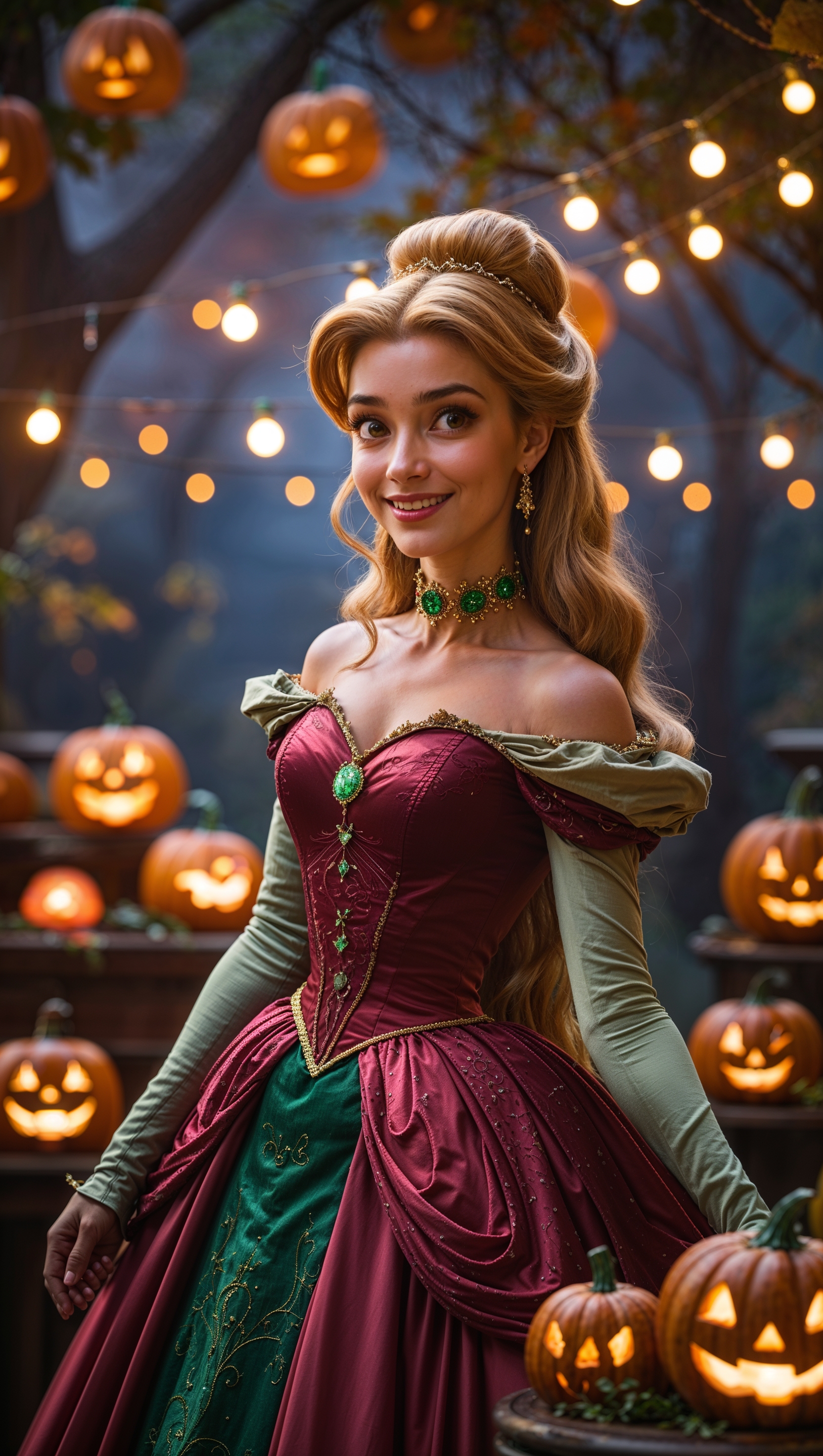 1664x2944 Princess Belle at a Halloween party with pumpkin lights