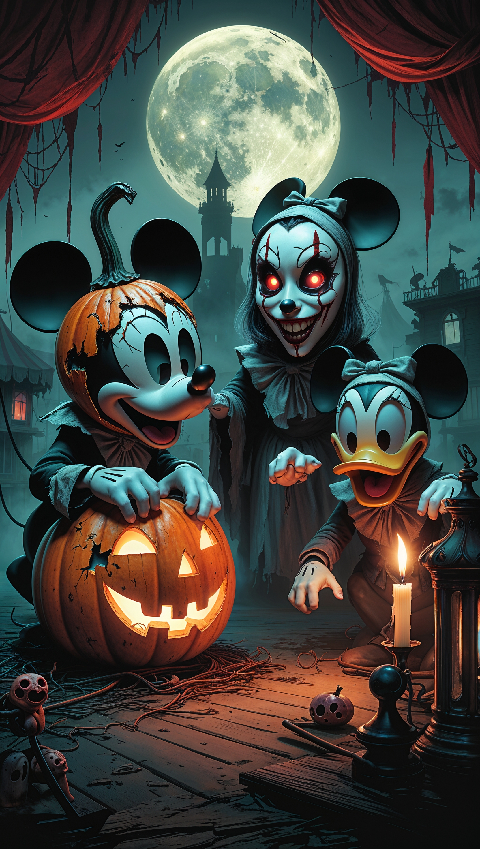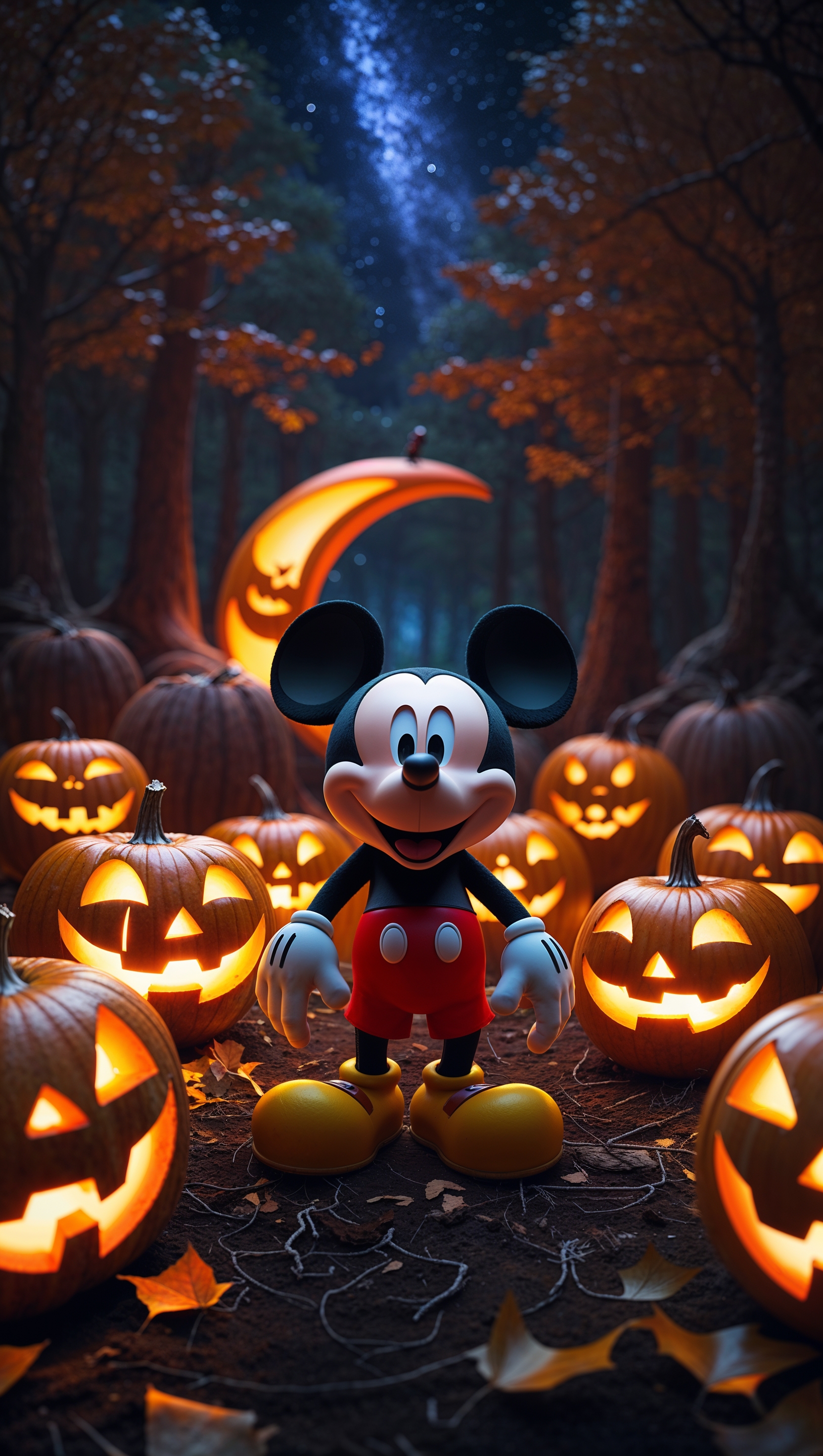 1664x2944 Mickey Mouse surrounded by glowing pumpkins at night