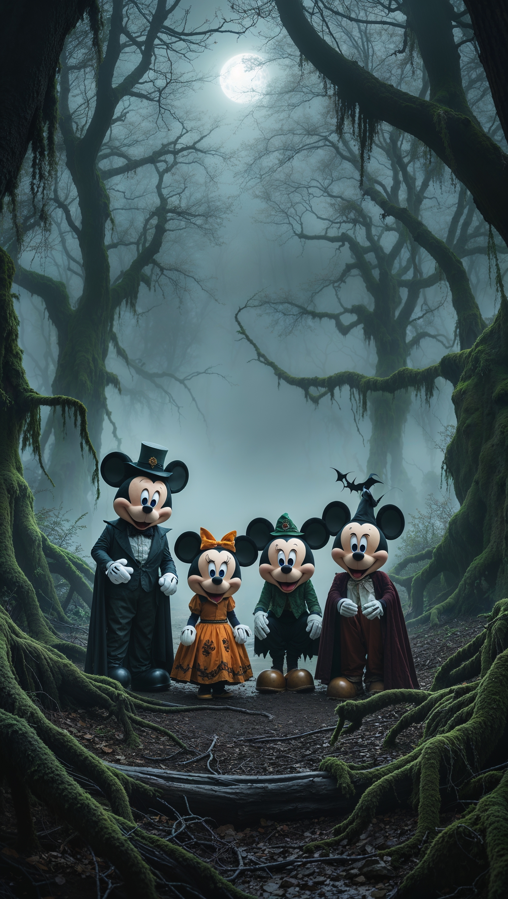 1664x2944 Disney characters in spooky costumes in a foggy forest