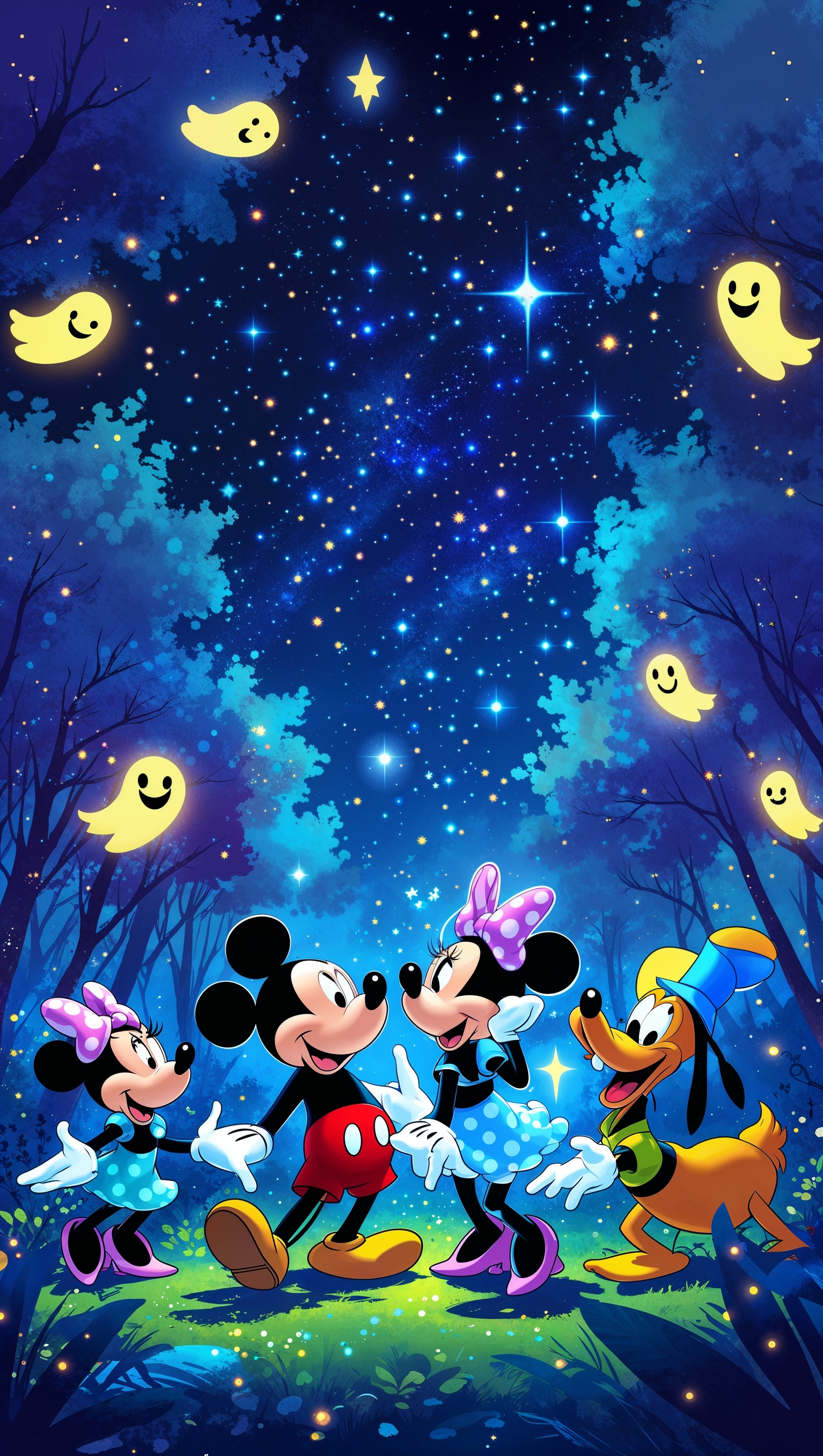 1664x2944 Disney characters on a starry night with tiny ghosts