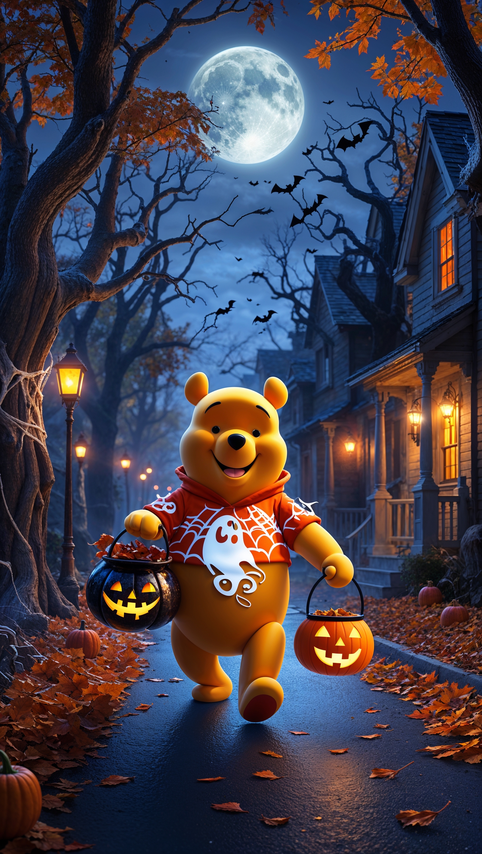 1664x2944 Winnie the Pooh trick-or-treating on a Halloween street