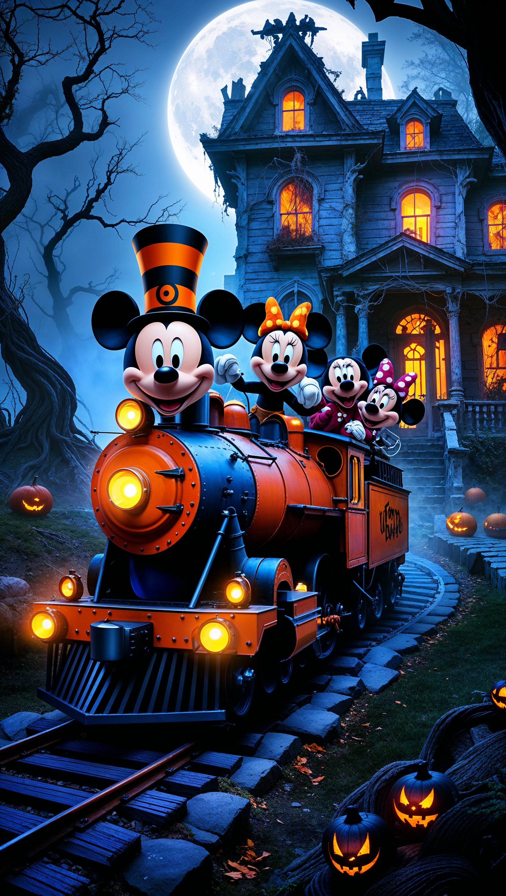 1664x2944 Mickey and friends on a spooky train heading to a haunted house