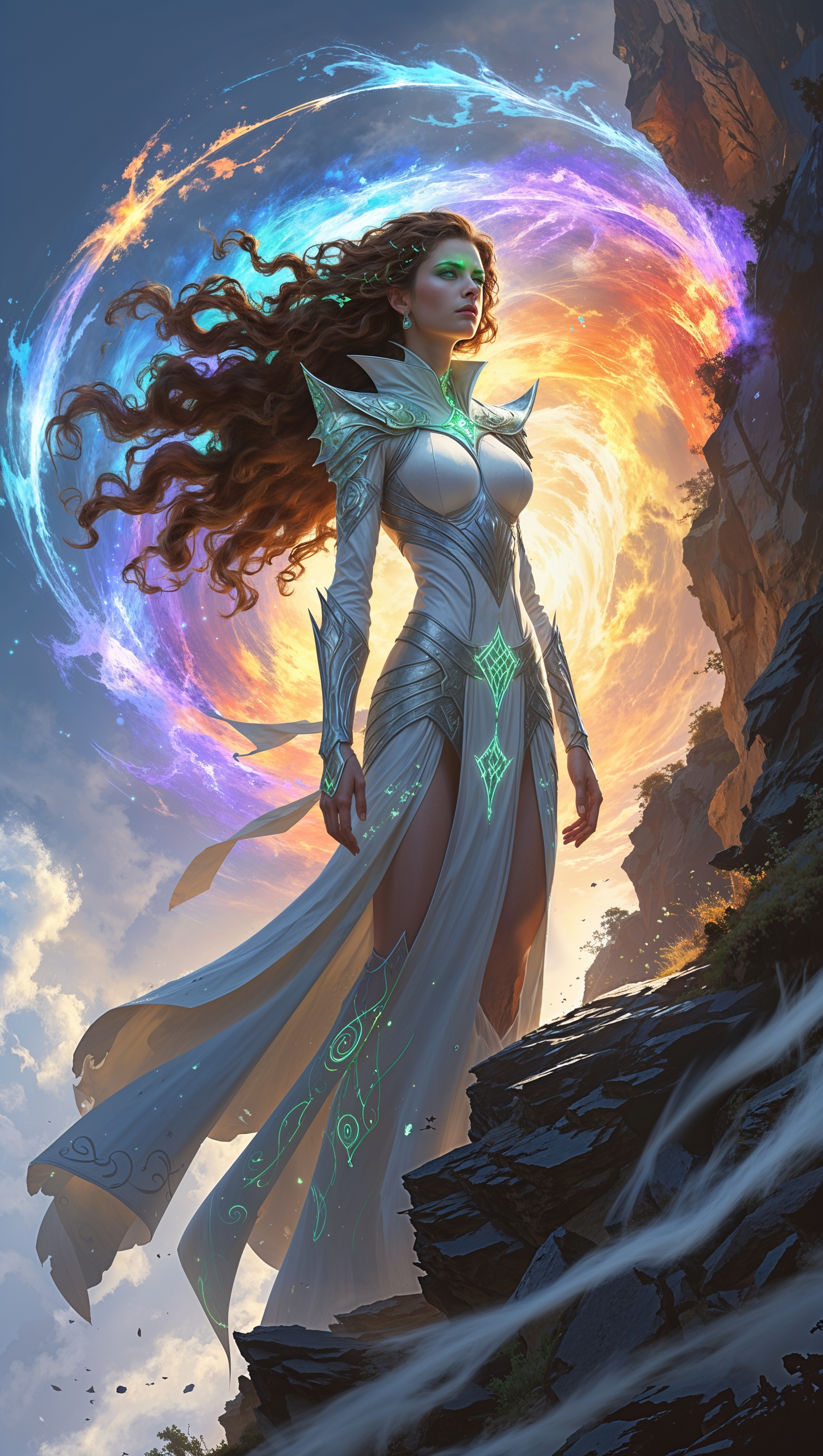 1664x2944 Female planeswalker standing on a cliff with swirling magic behind her