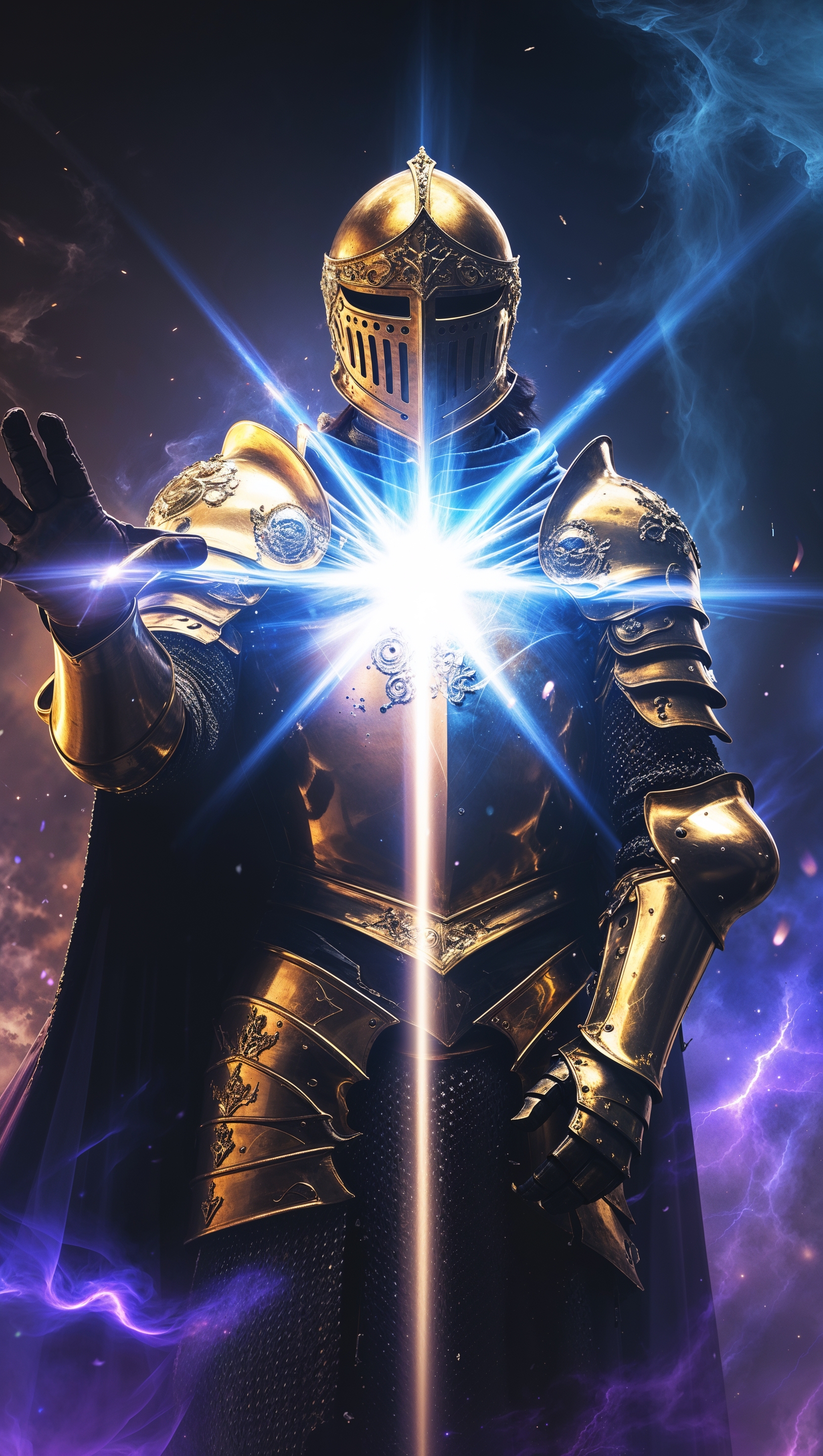 1664x2944 Knight in golden armor summoning light, dramatic fantasy lighting