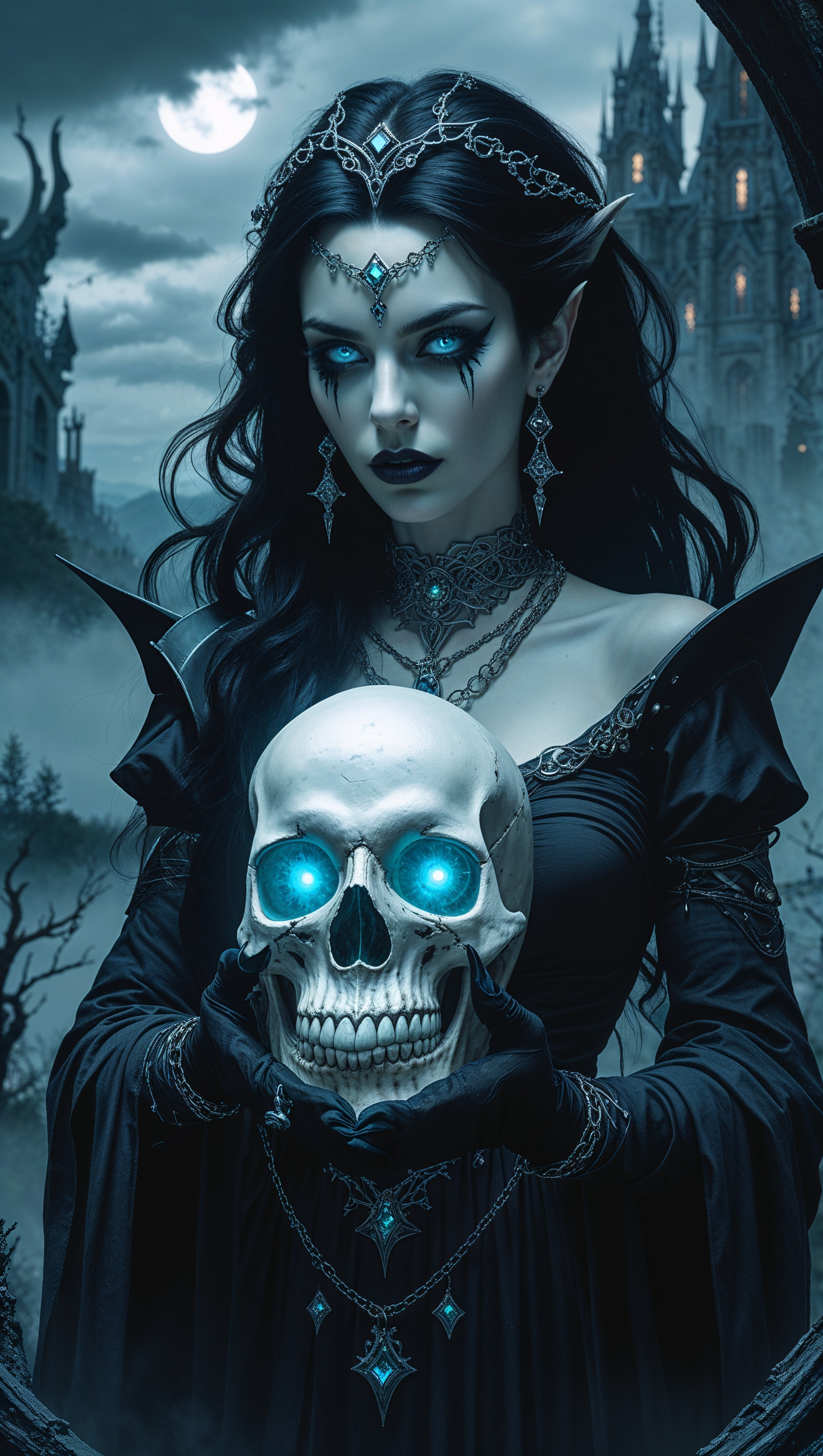 1664x2944 Dark sorceress holding a skull, gothic vibes, MTG themed iPhone background