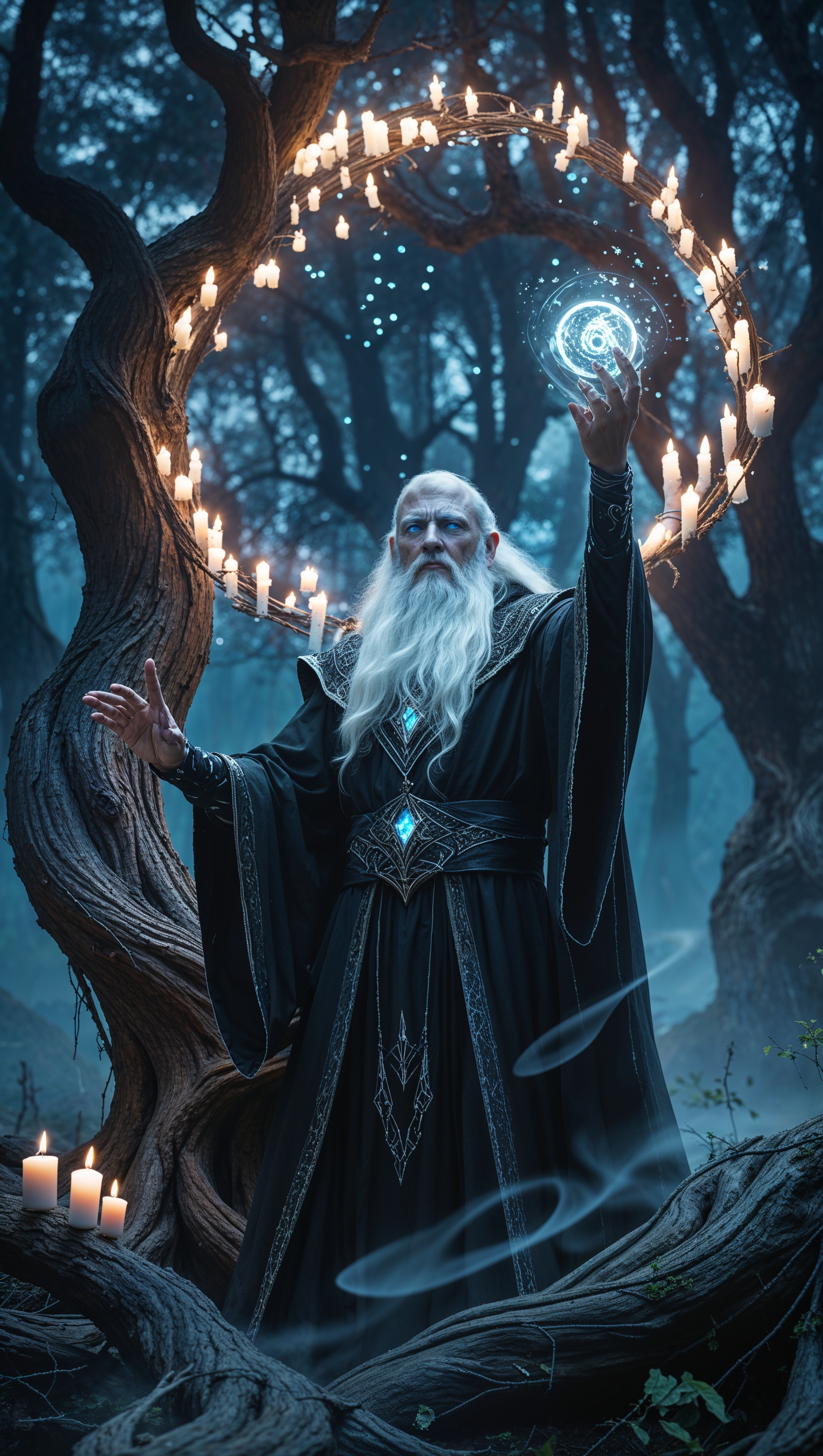 1664x2944 A powerful wizard casting a spell in a dark forest, Magic the Gathering style, iPhone wallpaper