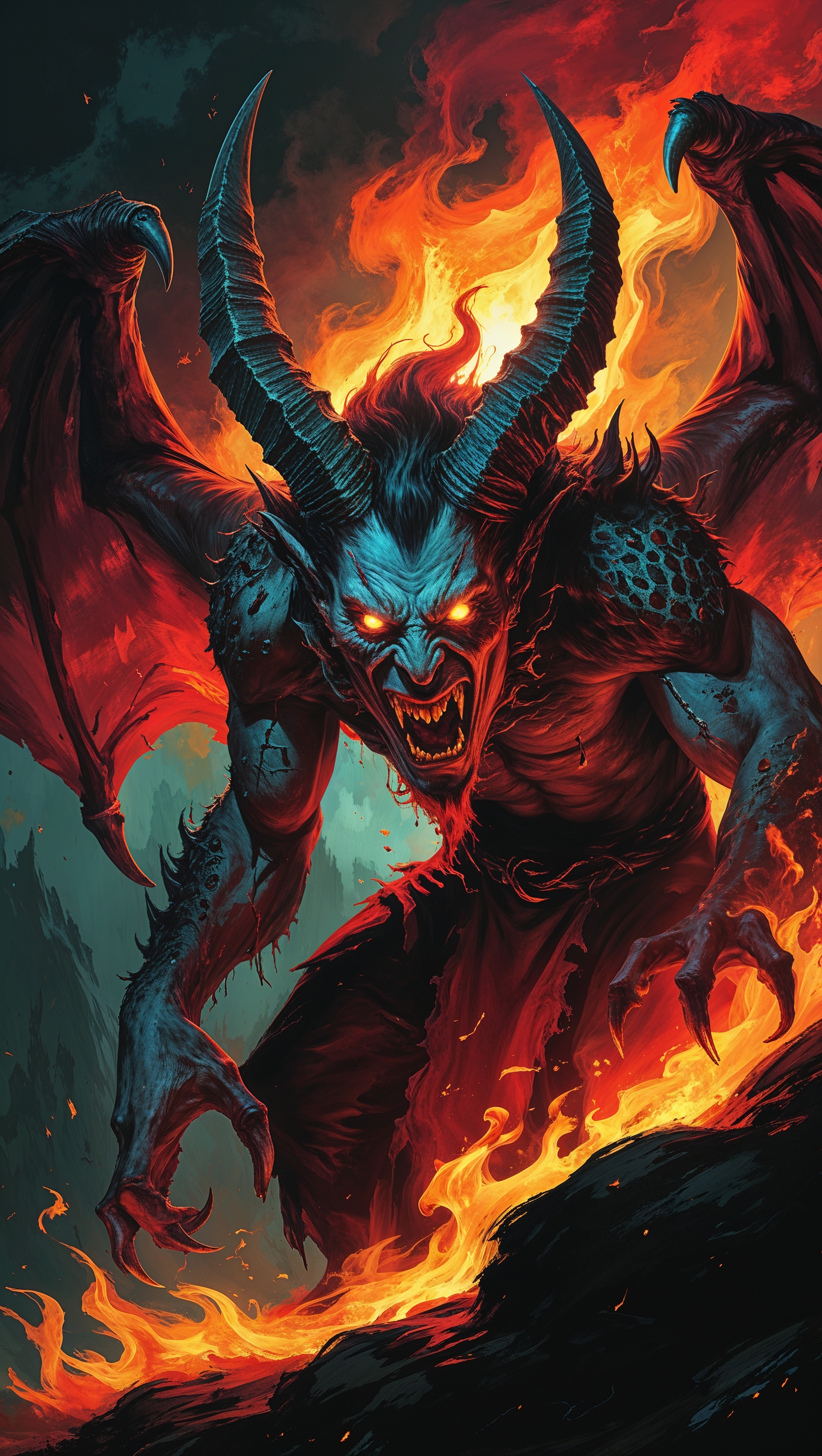 1664x2944 Demonic creature with glowing eyes, fiery background, MTG horror style