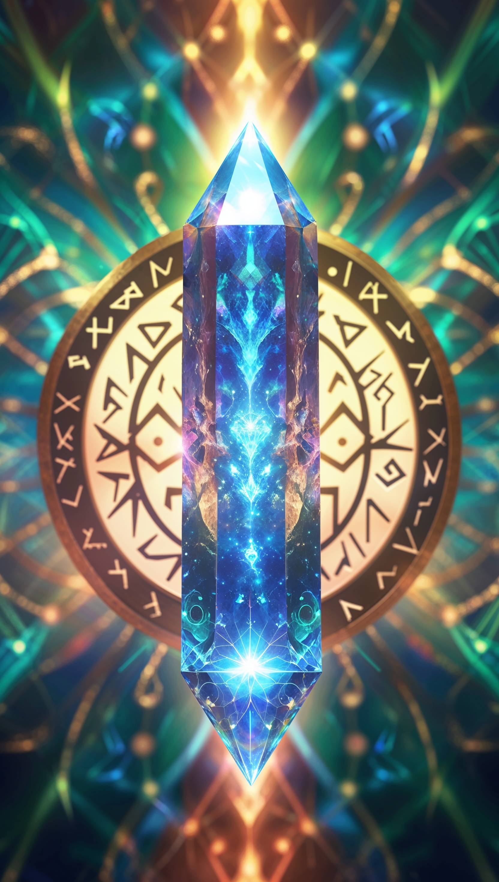 1664x2944 A glowing mana crystal surrounded by arcane runes, vibrant colors, iPhone wallpaper