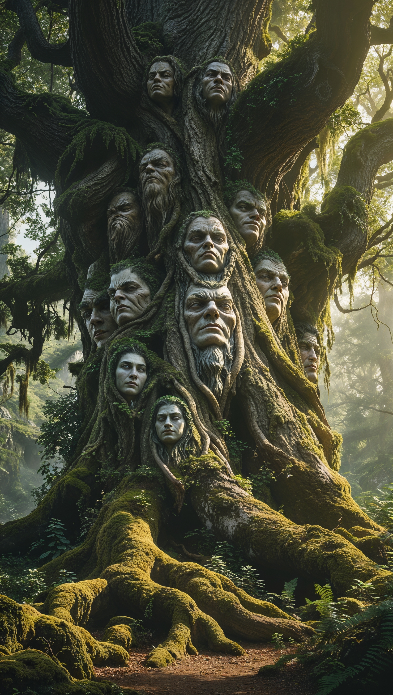 1664x2944 Ancient tree with faces in the bark, enchanted forest, Magic the Gathering theme