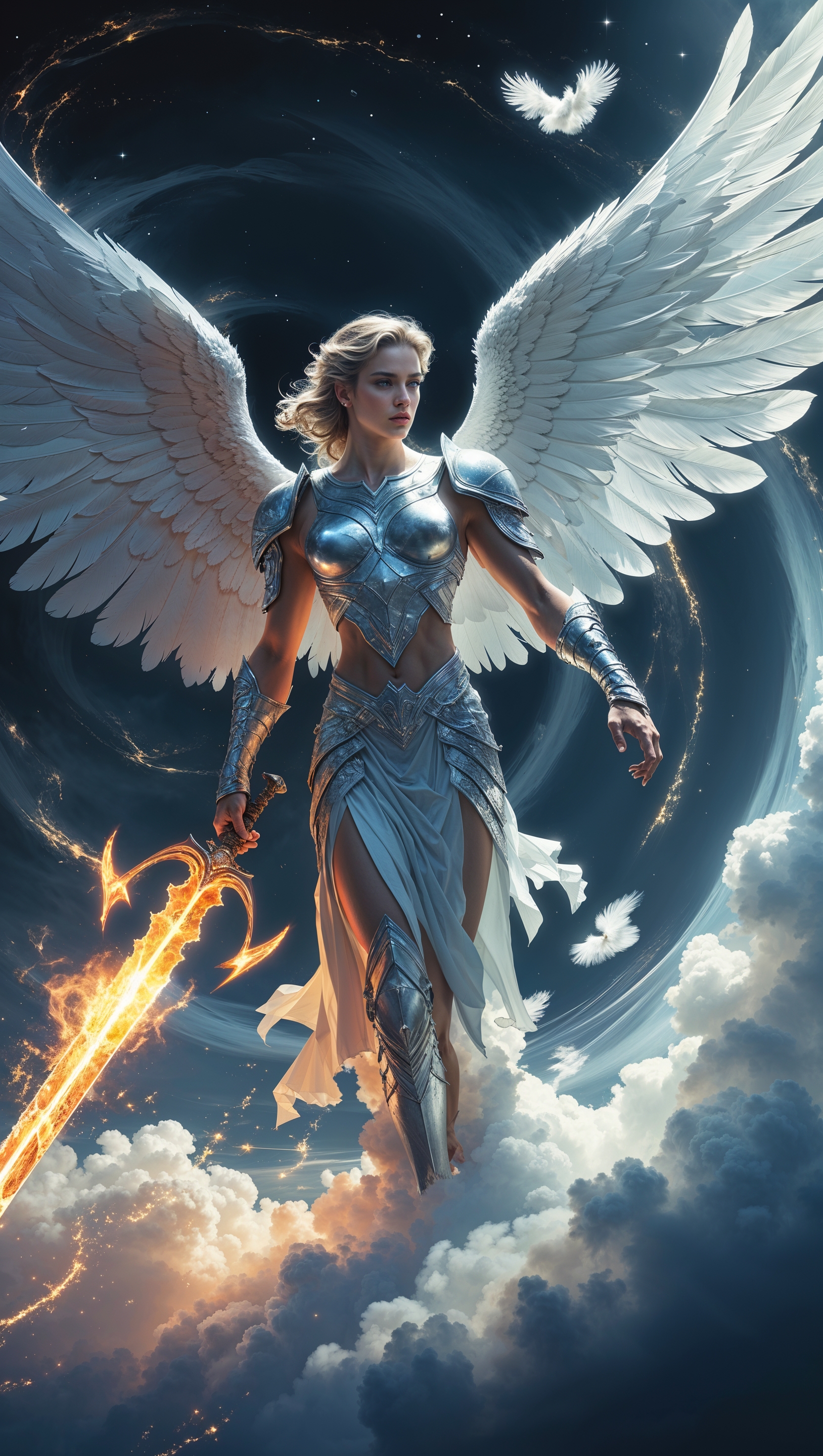 1664x2944 Angel descending from heaven with a blazing sword, high fantasy iPhone wallpaper