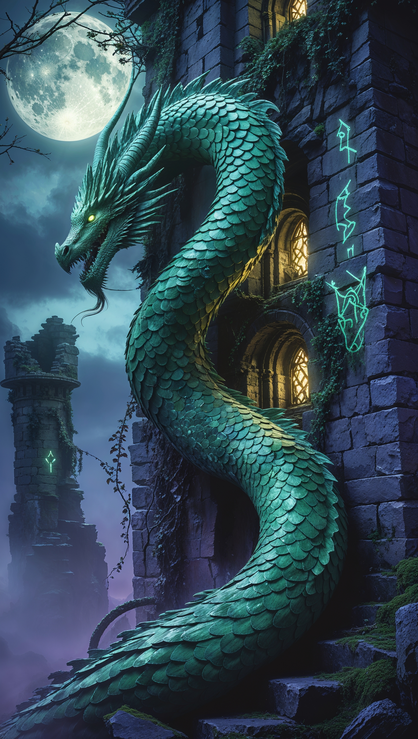 1664x2944 Ancient dragon coiled around a ruined tower, fantasy wallpaper
