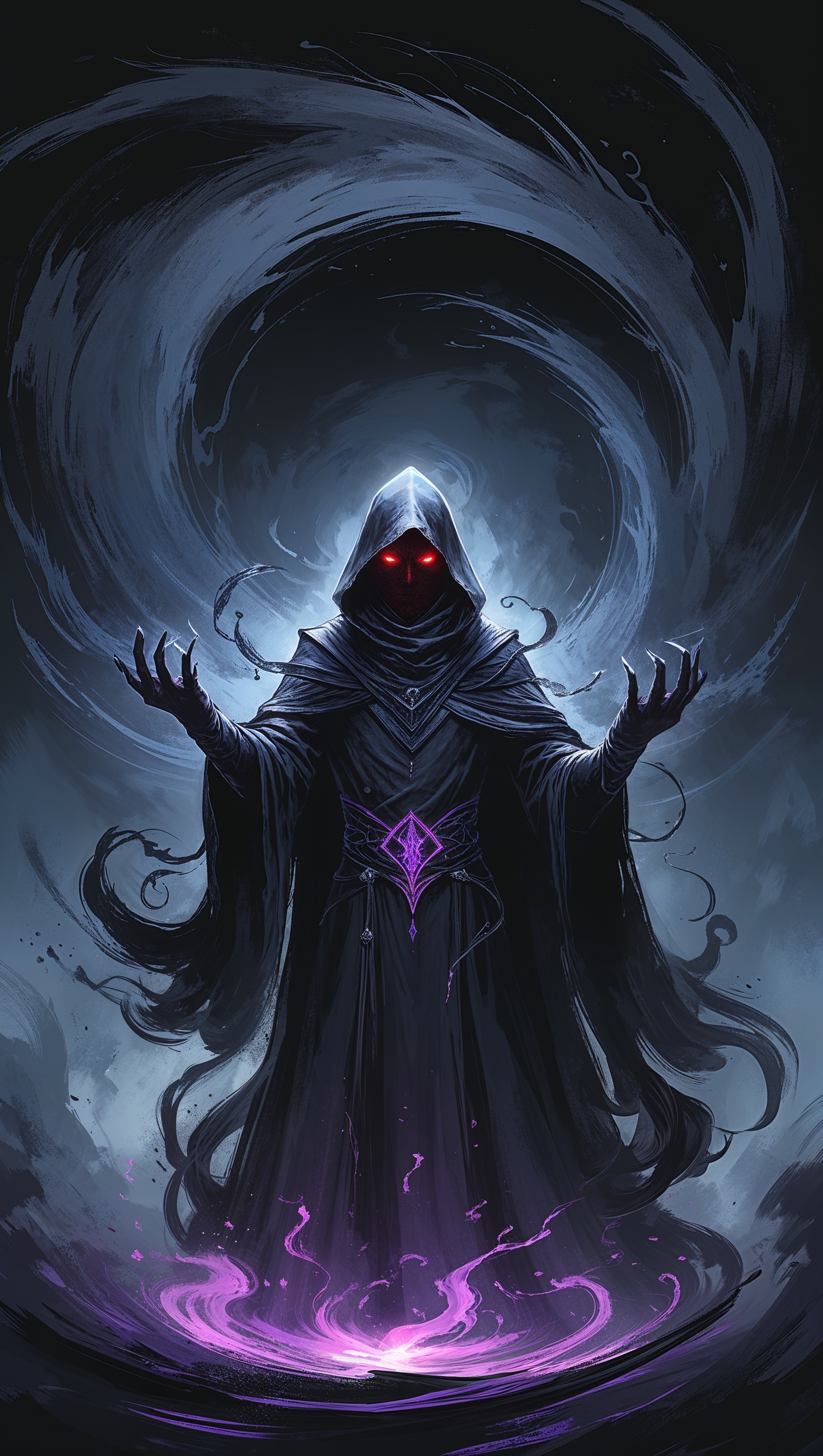 1664x2944 Shadowy figure with a hood summoning a black mist, MTG dark magic art