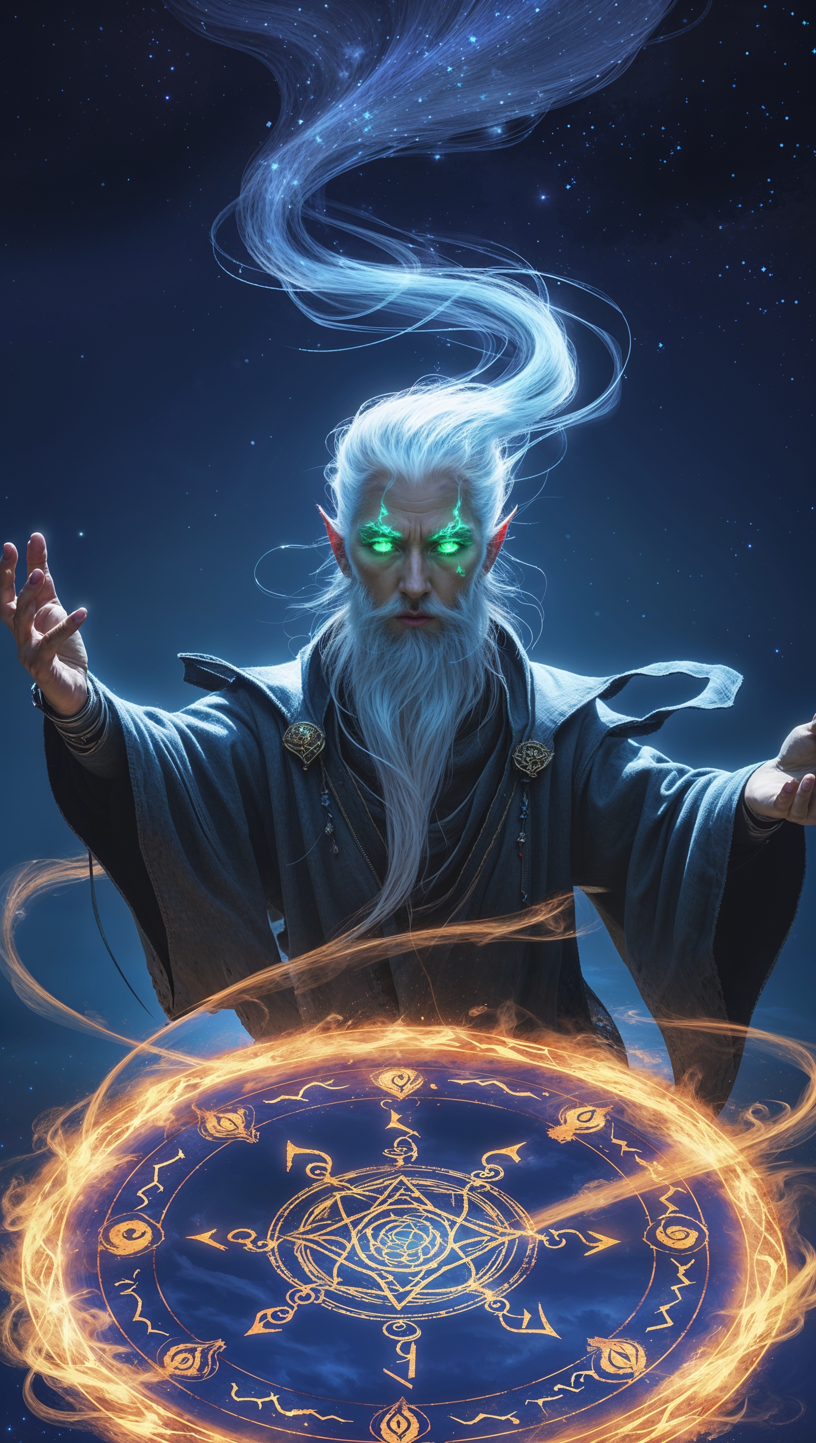 1664x2944 Mage levitating above a magical circle, glowing eyes and energy